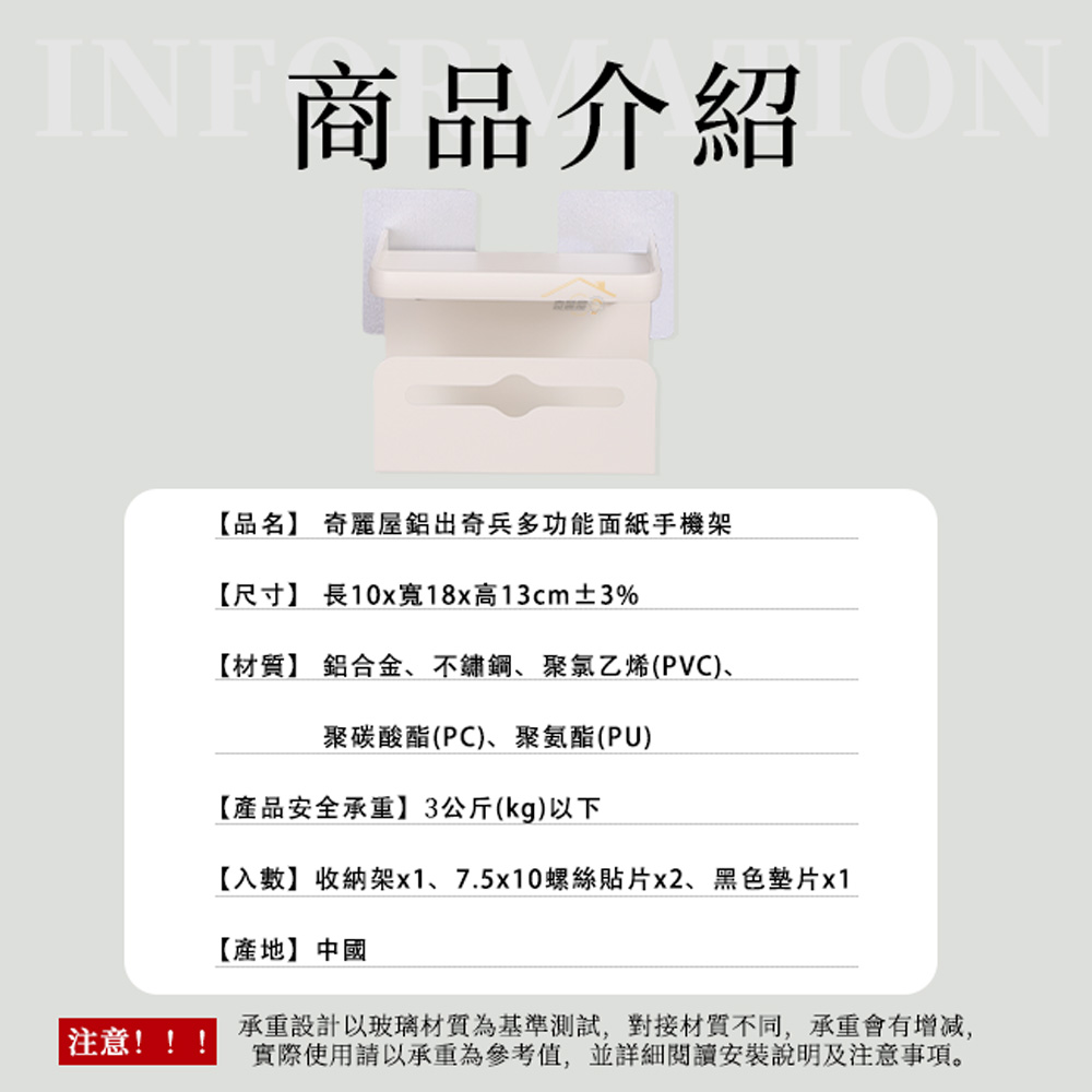 品名:奇麗屋鋁出奇兵多功能面紙手機架貨號:1476材質:鋁合金、不鏽鋼、聚氯乙烯(PVC)、聚碳酸酯(PC)、聚氨酯(PU)規格:長10x寬18x高13公分(cm)±3%重量:0.31公斤(kg)±5%(放置架)入數:放置架x1個、7.5x10螺絲貼片x2片、黑色墊片x1片產品安全承重:3公斤(kg)以下製造日期:標示於商品外盒上保存期限:未拆封10年產地:中國