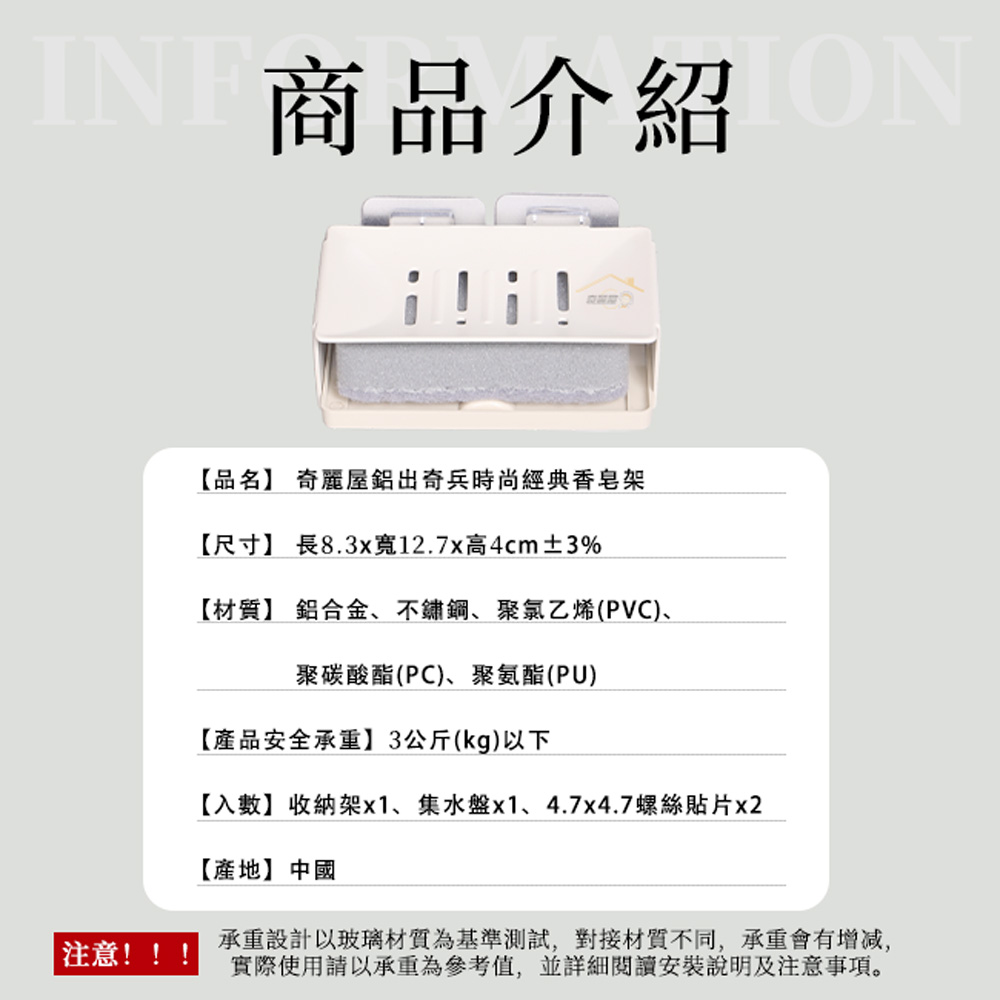 品名:奇麗屋鋁出奇兵時尚經典香皂架貨號:1506材質:鋁合金、不鏽鋼、聚氯乙烯(PVC)、聚碳酸酯(PC)、聚氨酯(PU)規格:長8.3x寬12.7x高4公分(cm)±3%重量:0.1公斤(kg)±5%(放置架+集水盤)入數:放置架x1個、集水盤x1個、7.5x4.9螺絲貼片x2片產品安全承重:1公斤(kg)以下製造日期:標示於商品外盒上保存期限:未拆封10年產地:中國