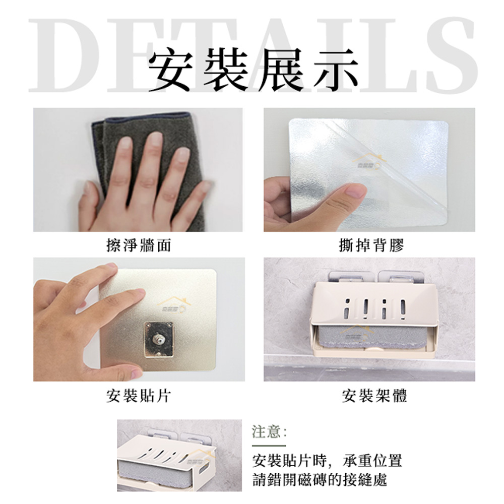 鏤空結構設計,瀝水通風,時尚簡約集水盤輕鬆拿取倒水方便,提升格調貼片防水、防油、防塵,牢牢貼合不鬆動免釘、免鑽、可重複使用,無痕多層膠
