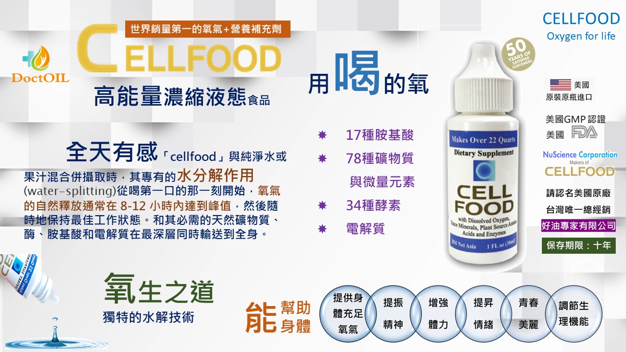 品 名:CELLFOOD 成 分:成分:純淨水、海水萃取物、紅藻萃取物、植物來源酵素(澱粉酶、蔗糖轉化酶、木瓜酵素、鳳梨酵素)、米醋內 容 量:30毫升/瓶 保存期限:十年產 地:美國保存方式:放置陰涼乾燥處,避免高溫、陽光直射, 開封後請儘速食用完畢並密封保存。食用方法:每天使用3次,每次8滴加入250毫升(依個人需求增減)涼開水或果汁稀釋使用。注意事項:1.避免與藥物、牛奶及豆漿一同飲用(間隔1小時以上)。2.飲用時宜使用玻璃、陶瓷或塑膠器皿盛裝及攪拌,不宜使用金屬容器。3.請避免直接與眼睛接觸。4.本產品含有消化和新陳代謝酵素,能分解有機物,應避免與天然纖維(絲、綿、羊毛)和其他有機物(如皮革、木頭、石化產品、塑料貼面和人造皮革)接觸。※退換貨須知:7天鑑賞(猶豫)期之權利【鑑賞(猶豫)期非試用期】,辦理退貨商品必須是全新狀態且包裝完整,否則將會影響退貨權限。