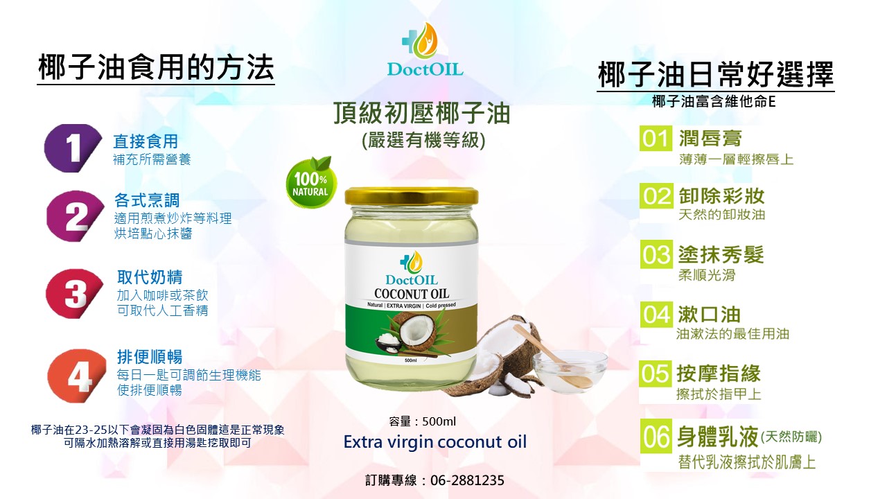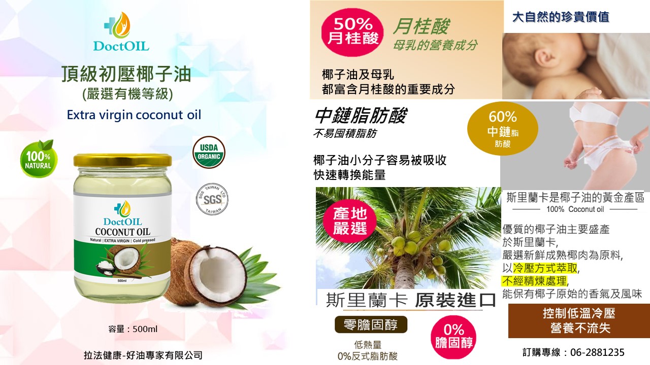 品 名:特級冷壓初榨椰子油(嚴選有機等級)成 分:椰子油內 容 量:500ml/瓶保存期限:二年產 地:斯里蘭卡來自斯里蘭卡原裝原瓶,非桶裝油分裝!!保存方式:放置陰涼乾燥處,避免高溫、陽光直射,開封後請儘 速食用完畢並密封保存以防受潮。食用方法:每次15ml。可當料理食用油、烘焙糕點使用。 **純素可食用**