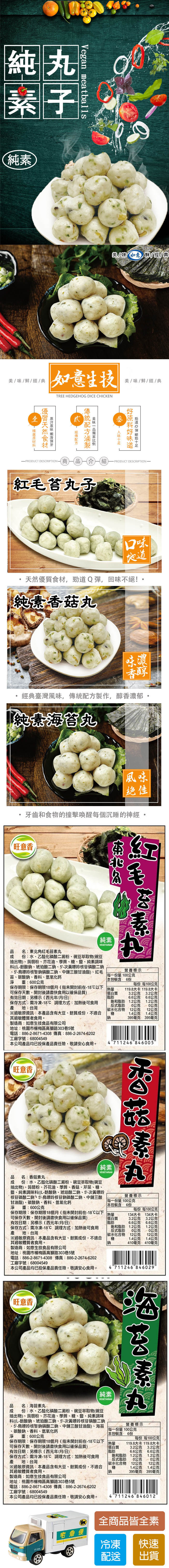 品名:香菇素丸 成份:水、乙醯化磷酸二澱粉、豌豆萃取物(豌豆抽出物)、蒟蒻粉、芥花油、荸萁、香菇、芹菜、糖、鹽、純素調味料(L-麩酸鈉、琥珀酸二鈉、5'-次黃嘌呤核苷鈉磷酸二鈉、5'-鳥嘌呤核苷鈉磷酸二鈉、中鏈三酸甘油酯)、碳酸鈉、香料、氫氧化鈣 品名:海苔素丸 成份:水、乙醯化磷酸二澱粉、豌豆萃取物(豌豆抽出物)、蒟蒻粉、芥花油、荸萁、糖、鹽、純素調味料(L-麩酸鈉、琥珀酸二鈉、5'-次黃嘌呤核苷鈉磷酸二鈉、5'-鳥嘌呤核苷鈉磷酸二鈉、中鏈三酸甘油酯)、海苔、碳酸鈉、香料、氫氧化鈣 品名:東北角紅毛苔素丸 成份:水、乙醯化磷酸二澱粉、豌豆萃取物(豌豆抽出物)、蒟蒻粉、芥花油、荸萁、糖、鹽、純素調味料(L-麩酸鈉、琥珀酸二鈉、5'-次黃嘌呤核苷鈉磷酸二鈉、5'-鳥嘌呤核苷鈉磷酸二鈉、中鏈三酸甘油酯)、紅毛苔、碳酸鈉、香料、氫氧化鈣