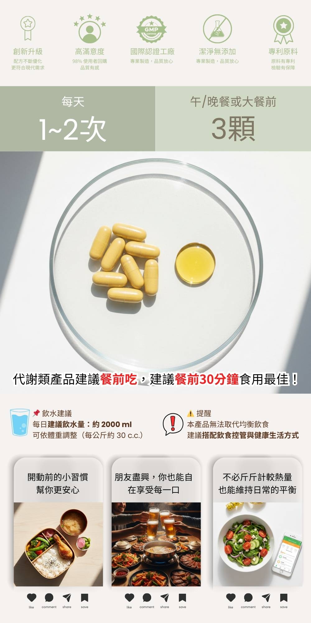 建議餐前補充,午餐與晚餐前各 3 顆,並搭配足夠飲水。