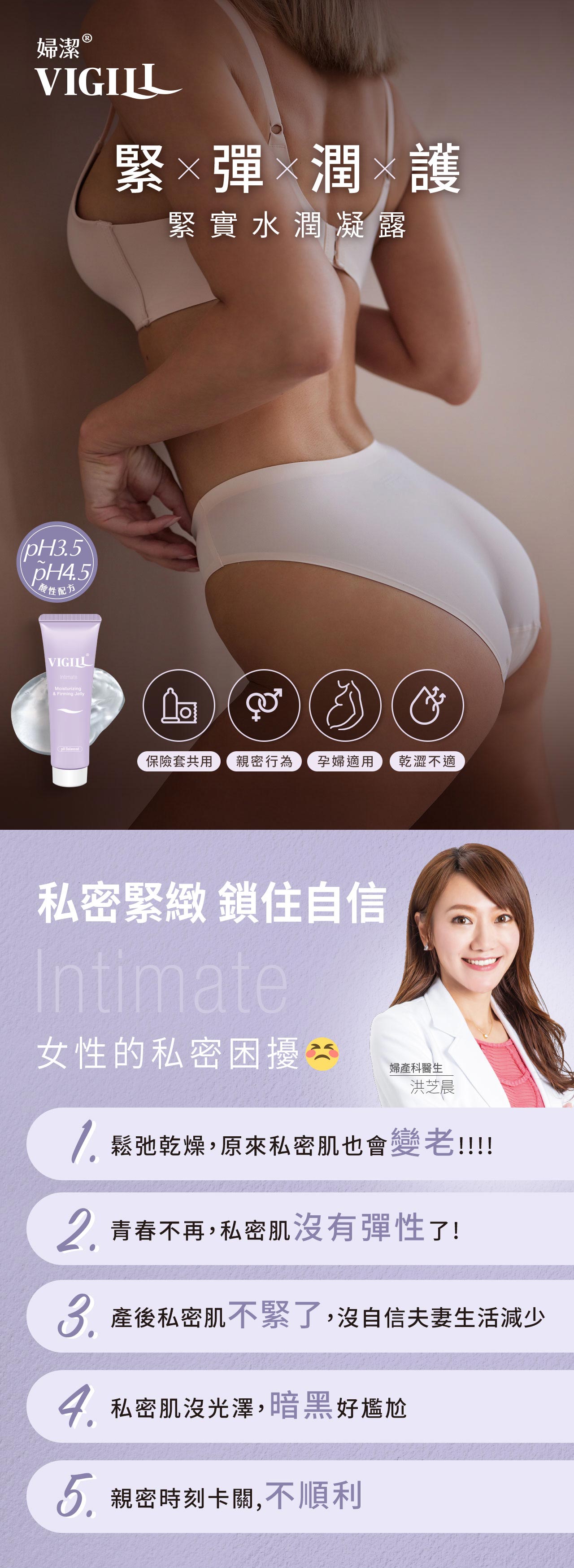 私密專用青春水潤配方!彈。潤。緊。護彈- 添加山藥萃取,植物性青春幸福成分,幫助私密肌回復彈力潤澤。潤- 蘆薈精華與小分子海藻糖,模仿女性私密滑潤感,絲緞般豐潤飽滿。緊- 燕麥的低分子多醣及柑橘萃取,能幫助緊緻肌膚,搭配凱格爾運動效果更好。護- pH3.5~4.5私密專用酸性配方,含德國洋甘菊水性精華及維他命E衍生物,修護肌膚舒緩不適感。〔不含香精、精氨酸,孕婦、哺乳媽媽亦適用〕