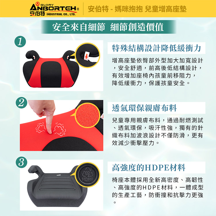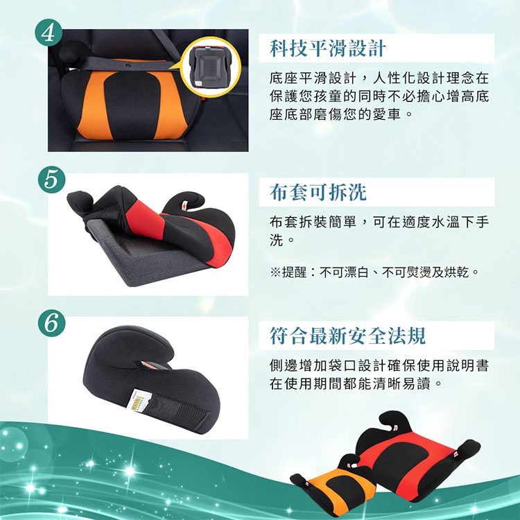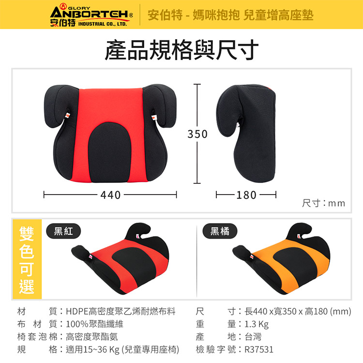 此款"兒童安全增 高座墊"是目前唯一專為『較大年齡學童』設計的安全增 高座墊,適用15-36公斤孩童(約4-12歲適用),並為一體成行射出,椅套材質透氣/可拆洗,安全舒適方便整理!!