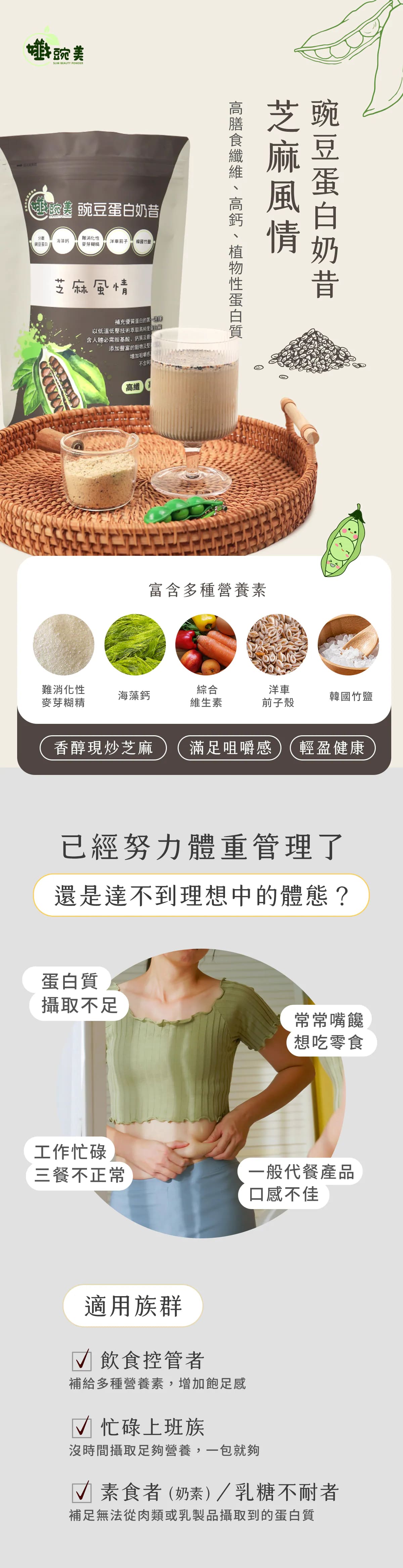 豌豆蛋白、黑芝麻(黑芝麻粉、黑芝麻粒、難消化性麥芽糊精、椰花蜜糖、全脂奶粉、脫脂奶粉、赤藻糖醇(甜味劑)、穀物顆粒(紅藜麥粒、蕎麥粒、椰花蜜糖)、青仁黑豆、黑糯米、葡萄糖、麥芽糊精、洋車前子殼、奇亞籽、燕麥片、海藻鈣、寒天粉、竹鹽、核桃、綜合維生素:抗壞血酸(維生素C)、乙酸dl-o-生育醇酯(維生素E)(維生素E、辛烯基丁二酸鈉澱粉、蔗糖、玉米澱粉、矽鋁酸鈉)、菸鹼醯胺、微結晶纖維素、維生素A粉末(蔗糖、玉米澱粉、阿拉伯膠、維生素A、維生素E、磷酸鈣)、本多酸鈣、氰鈷胺明(維生素B12)(D-甘露醇、維生素B12)、膽鈣化醇(維生素D3)(麥芽糊精、辛烯基丁二酸鈉澱粉、蔗糖、維生素D3)、維生素K1(葡萄糖漿、阿拉伯膠、維生素K1、磷酸鈣)、鹽酸吡哆辛(維生素B6)、硝酸硫胺明(維生素B1、硝酸噻胺)、核黃素(維生素B2)、葉酸、生物素(麥芽糊精、生物素)