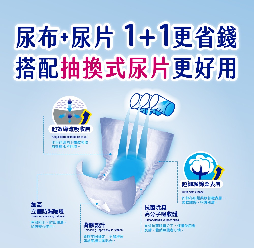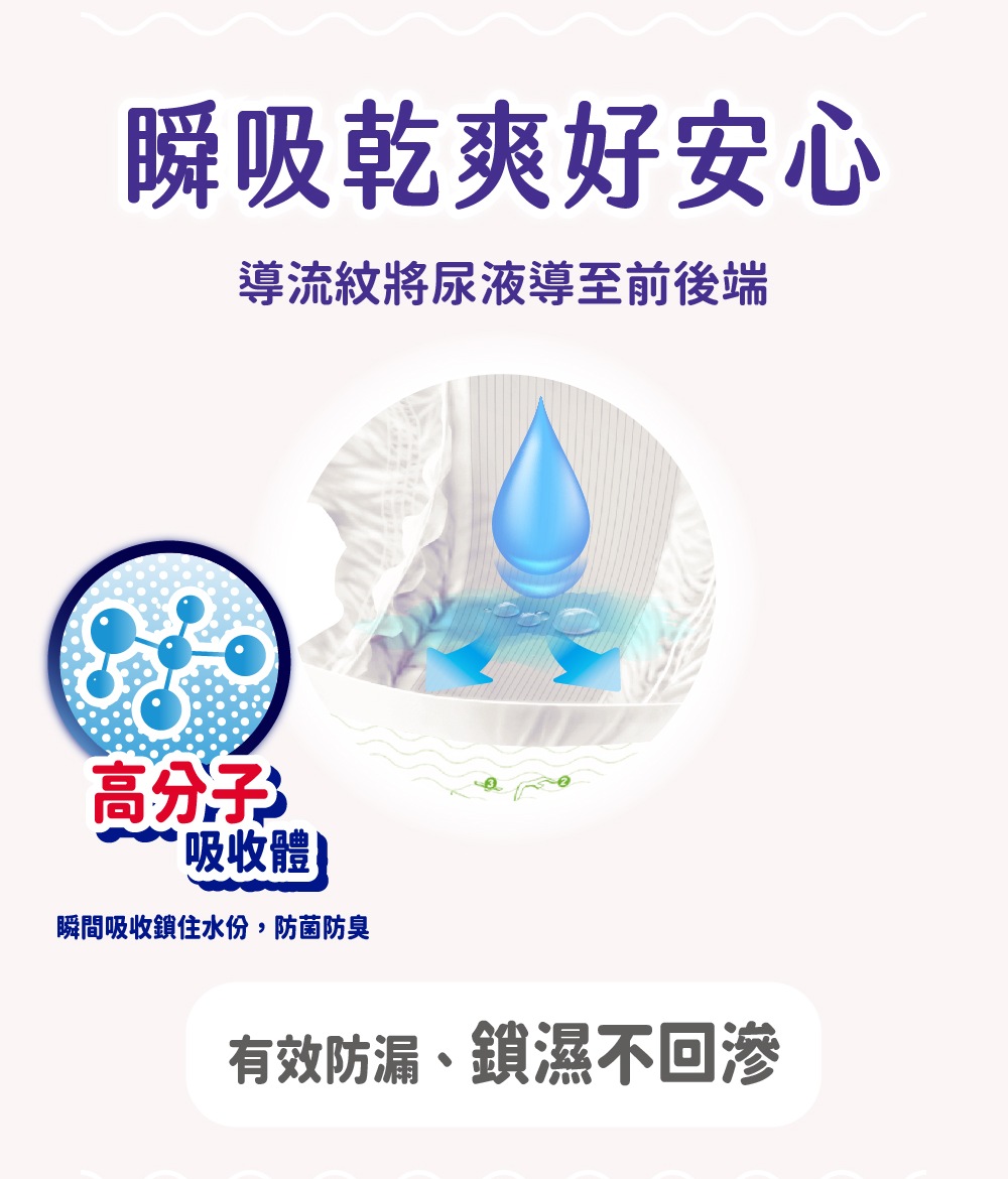 •添加獨特ZIOX配方,有效抑制金黃色葡萄球菌及大腸桿菌•彈性伸縮腰圍設計•隨意再貼區•立體防漏隔邊設計,安心不外漏•超柔軟表層,快速吸收,乾爽不回滲•超效導流紋•抑菌除臭高分子吸收層,有效鎖住臭味
