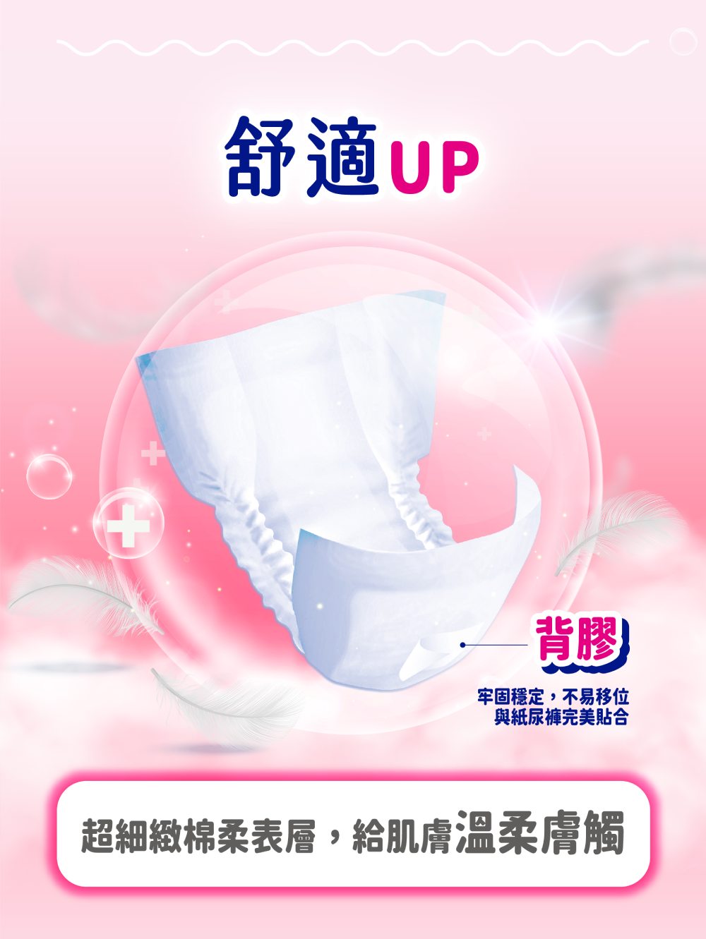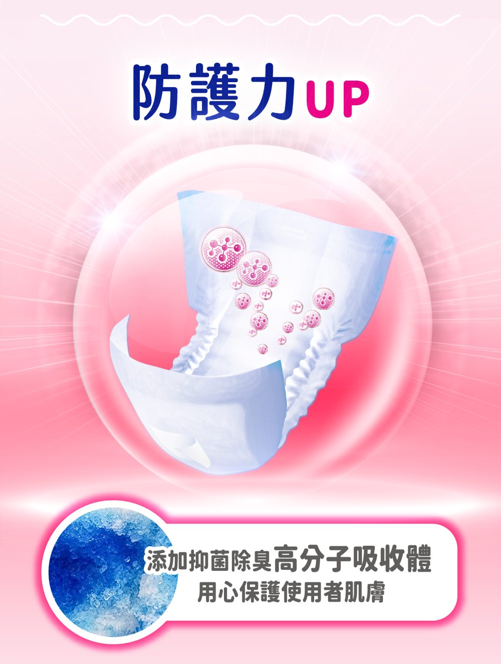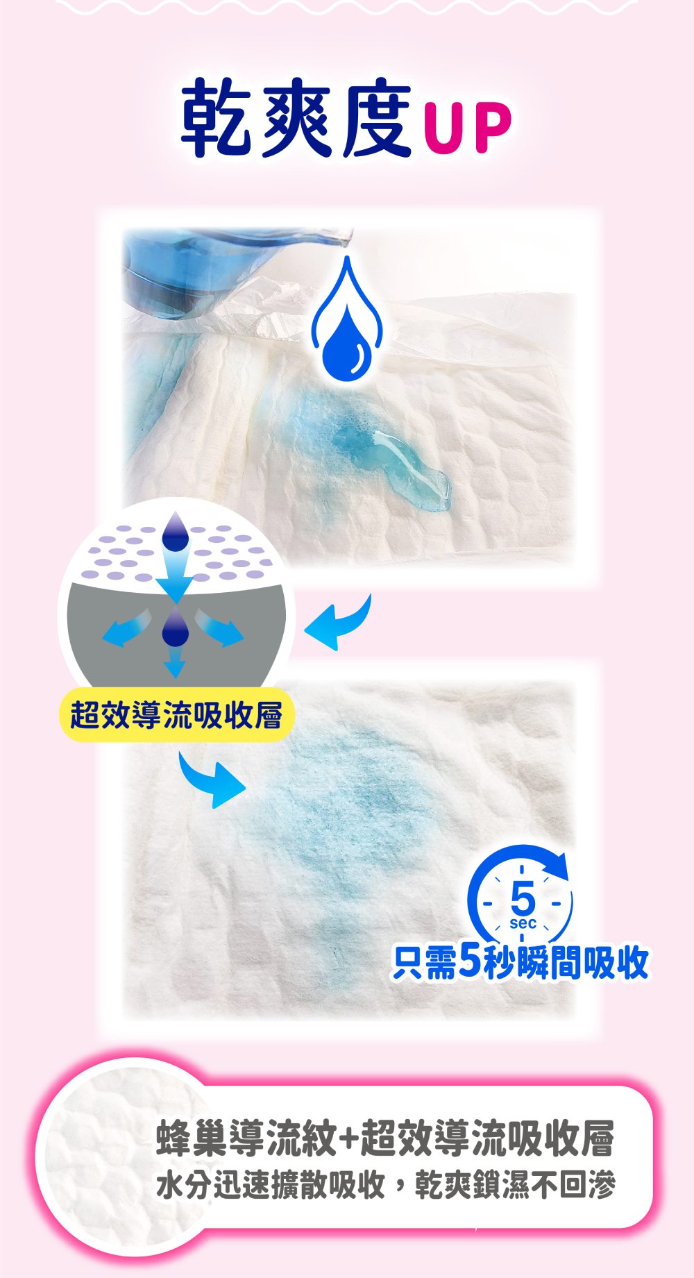 •水份迅速向下擴散吸收,有效鎖水不回滲。•超效導流吸收層,快速導出尿液,乾爽不回滲•強化背膠固定設計,防止滑動