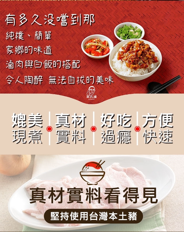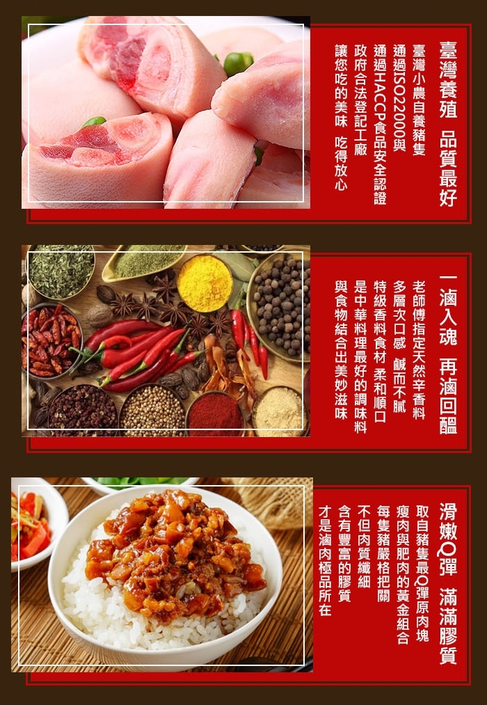 成分:豬肉、豬皮、醬油膏、冰糖、紅蔥酥、蒜頭、肉桂、胡椒