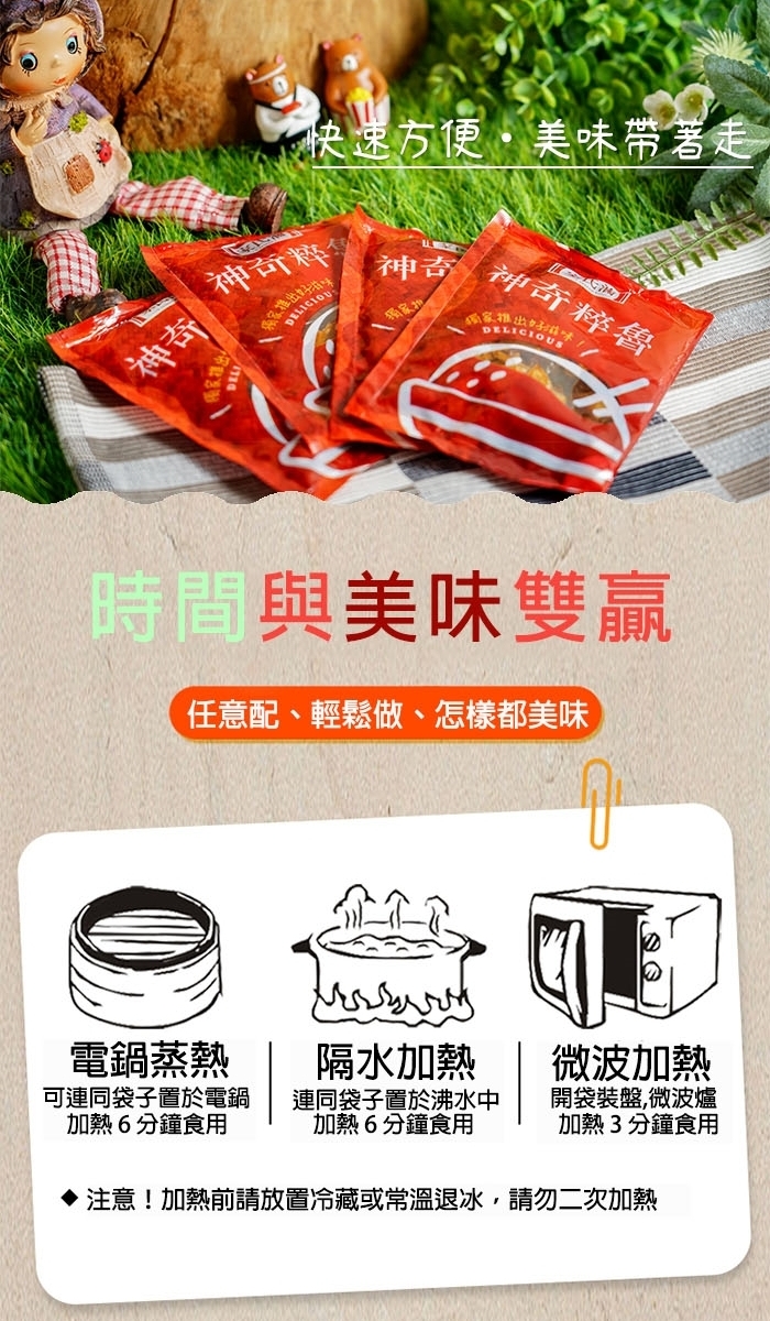 1、隔水加熱:將本產品直接放入滾水容器中,隔水加熱2-3分鐘,即可食用