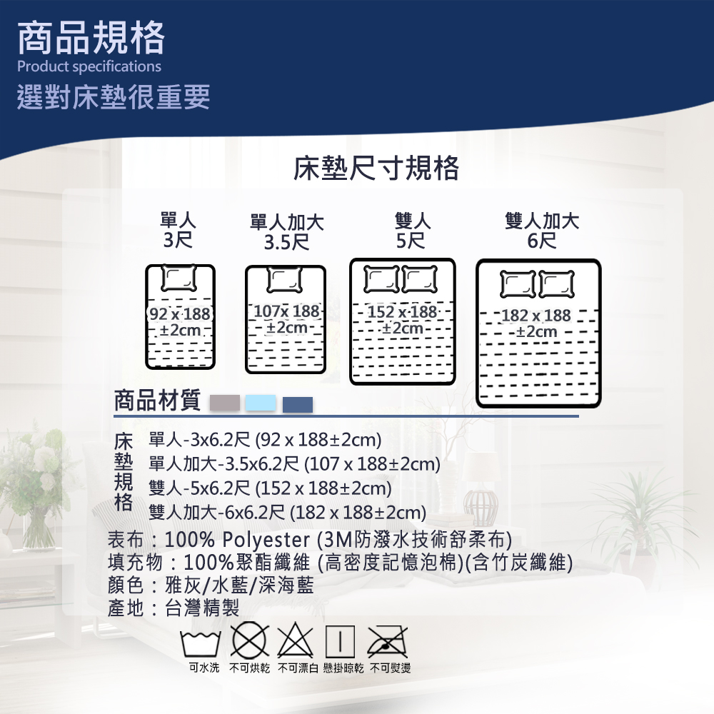 內容/規格:5CM雙人-5x6.2尺 (152 x 188±2cm)表布:100% Polyester (3M防潑水技術舒柔布) 填充物:100%聚酯纖維 (高密度記憶泡棉)(含竹碳纖維) 床墊套洗滌方式:可水洗/不可烘乾/不可漂白/懸掛晾乾/不可熨燙 原產地:台灣精製