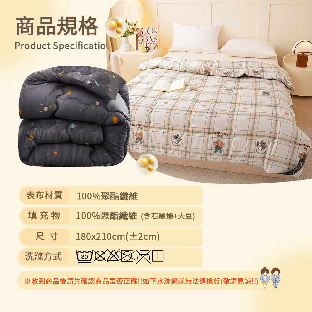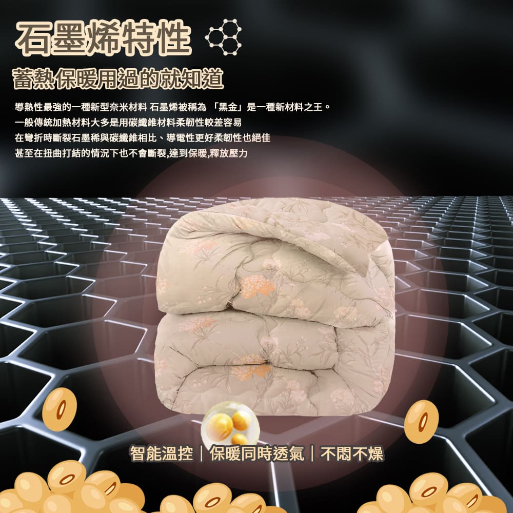 【商品副標】恆溫舒適x親膚透氣x輕柔包覆【商品特色】● 石墨烯智能恆溫保暖透氣● 大豆纖維物理抗菌,柔軟親膚貼合● 隨蓋即用無需被套,輕鬆水洗【商品規格】尺寸:180x210 (±2公分)