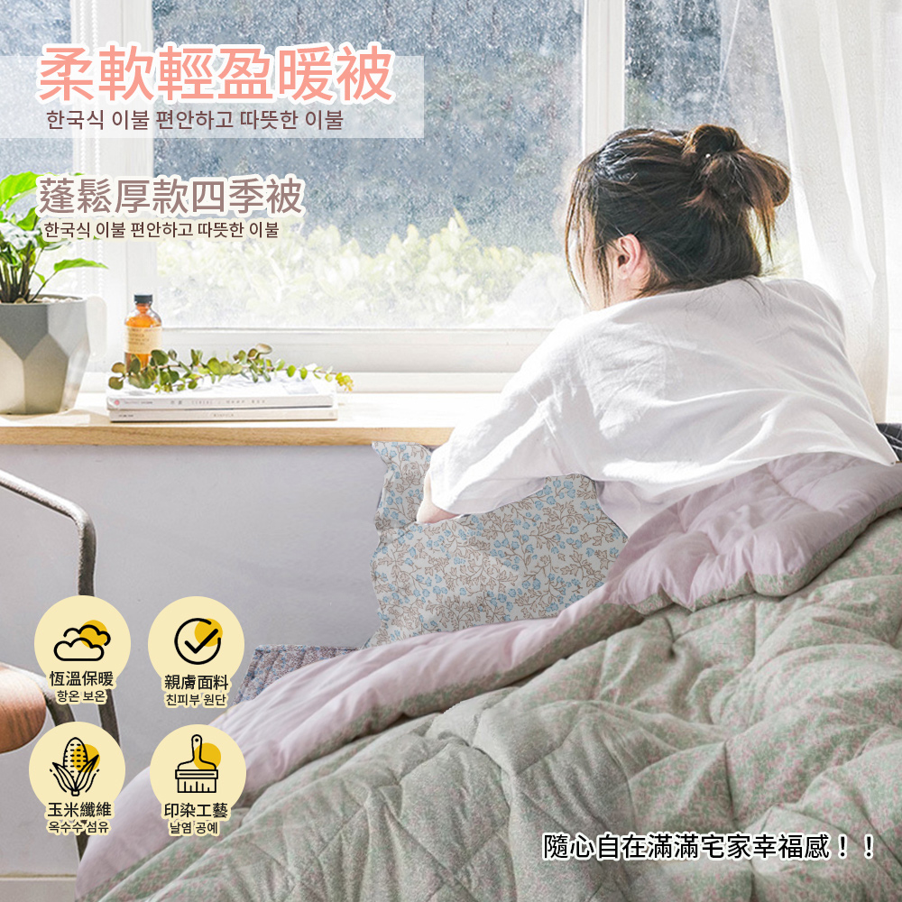 表布材質:聚酯纖維 (超細纖維100%)裡布材質:聚酯纖維 (超細纖維100%)填充物:聚酯纖纖維100%(玉米鬚纖維)尺寸/重量:150X205CM (±5cm)/1.7KG產地:韓國洗滌處理方式·水溫不可超過30*C/不可漂白/不可乾洗/不可烘乾/不可燙熨上述尺寸重量為人工測量±5%誤差值為正常範圍