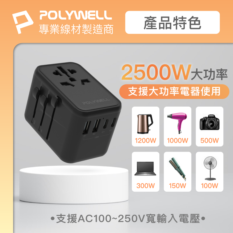 【適用大功率電器】最大支援2500W功率,可安全使用吹風機、熱水瓶等高耗電設備,穩定供電不跳電。