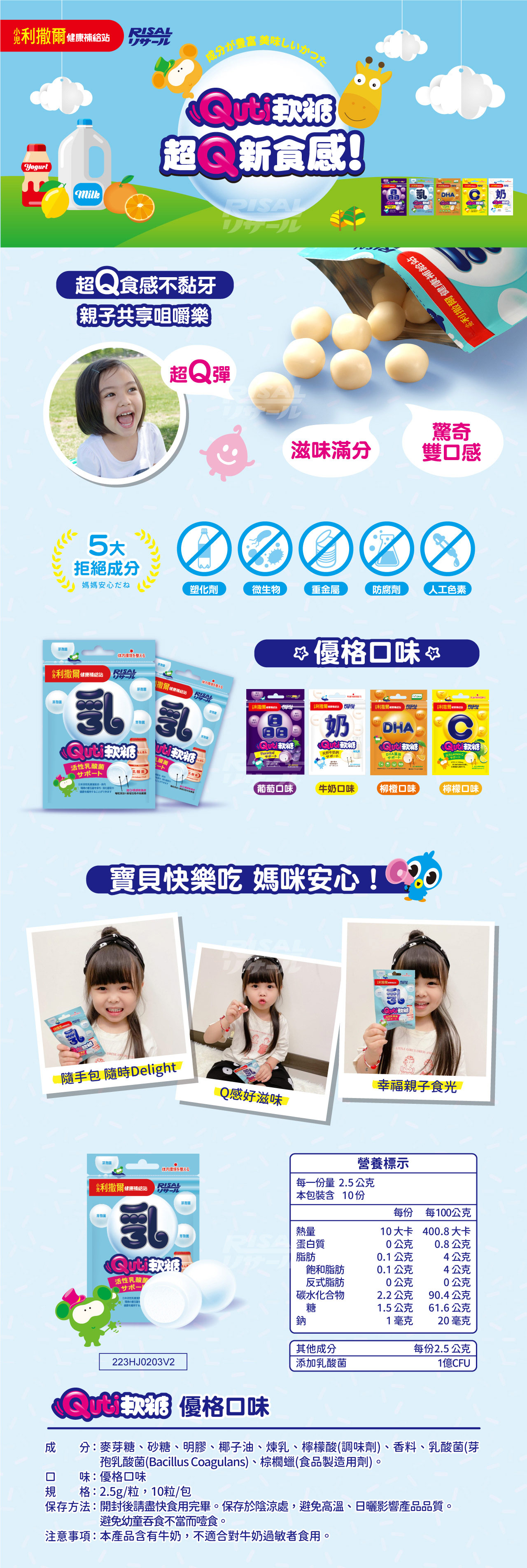 麥芽糖、砂糖、明膠、椰子油、煉乳、檸檬酸(調味劑)、香料、芽孢乳酸菌(Bacillus Coagulans)、棕櫚蠟(食品製造用劑)