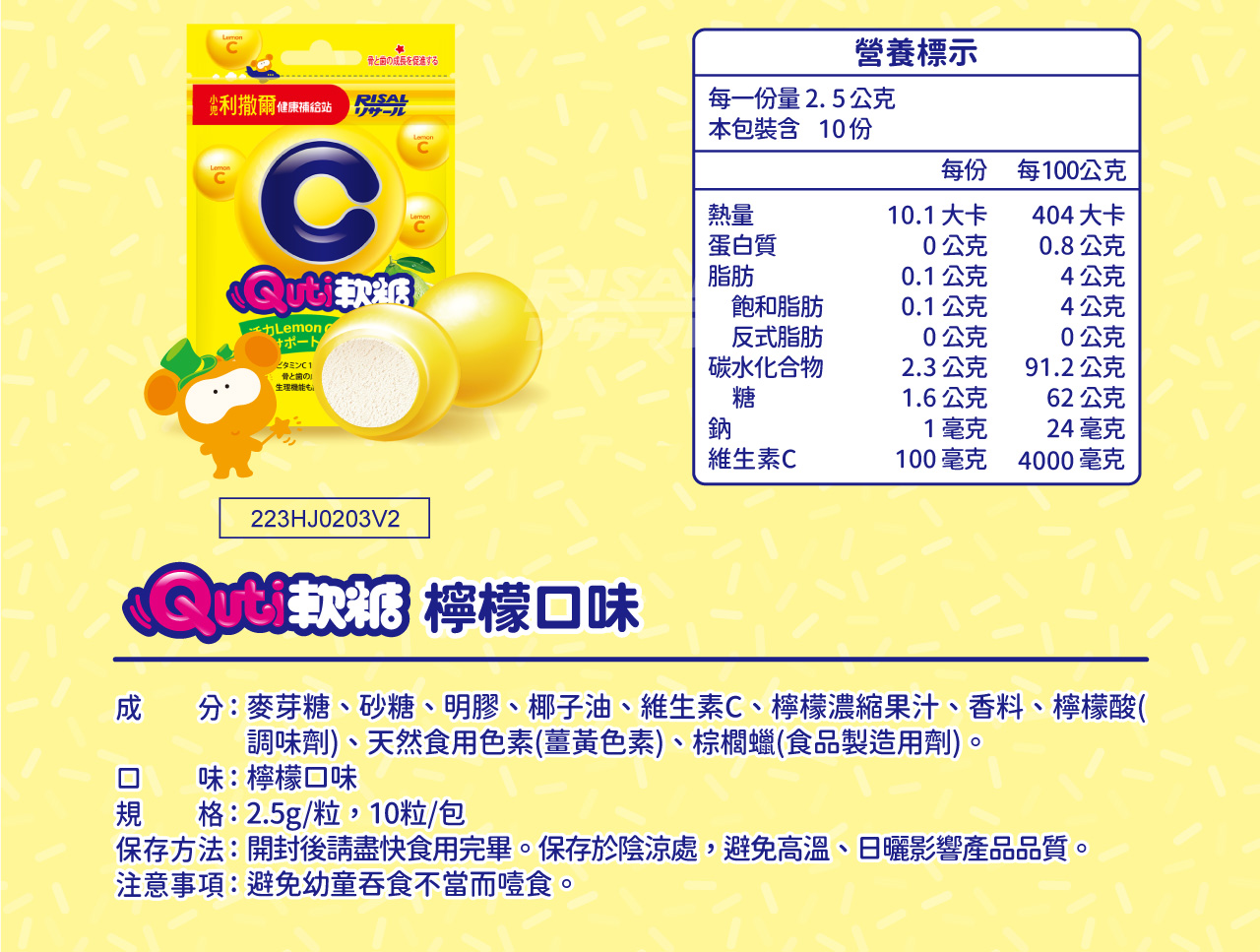 麥芽糖、砂糖、明膠、椰子油、維生素C、檸檬濃縮果汁、香料、檸檬酸(調味劑)、天然食用色素(薑黃色素)、棕櫚蠟(食品製造用劑)