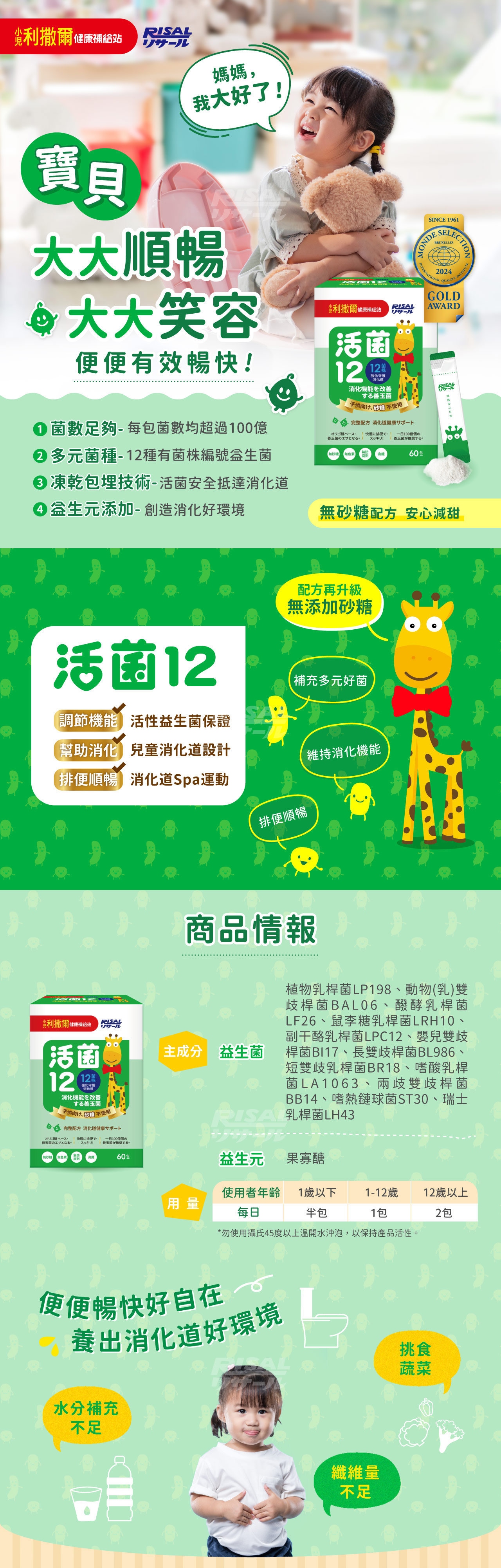 ●添加12種菌株益菌配方,多元完整的益生菌,改變消化道菌叢,幫助排便順暢。●以益生元為基底的無砂糖高纖配方,維持消化道機能,減少精製糖添加,少負擔、多健康。●選用專利包埋技術菌種配方(專利號:M603759),通過胃酸膽鹼試驗,幫助益菌安全抵達腸道,維持消化道健康。●使用獨特乳酸菌共生發酵技術,保留豐富的發酵微量產物,補充微量營養素。○無砂糖 ○無色素 ○無防腐劑 ○高纖