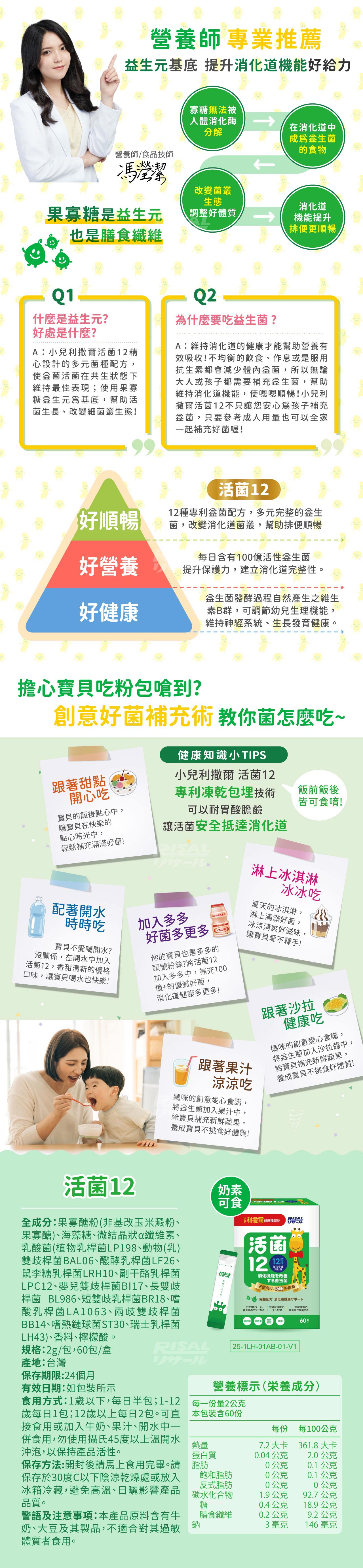全成分:果寡醣粉(非基改玉米澱粉、果寡醣)、海藻糖、微結晶狀 α- 纖維素、乳酸菌( 植物乳桿菌 (Lactobacillus plantarum LP198) 、 動物(乳)雙歧桿菌 (Bifidobacterium animalis subsp. lactis BAL06)、 醱酵乳 桿菌 (Lactobacillus fermentum LF26) 、鼠李糖乳桿菌 (Lactobacillus rhamnosus LRH10) 、 副干酪乳桿菌 (Lactobacillus paracasei LPC12) 、 嬰兒雙歧桿菌 Bifidobacterium longum subsp. Infantis BI17) 、 長雙歧 桿菌 Bifidobacterium longum BL986) 、 短雙歧乳桿菌 Bifidobacterium breve BR18) 、 嗜酸乳桿菌 (Lactobacillus acidophilus LA1063 、 兩歧雙歧桿菌 Bifidobacterium bifidum BB14) 、 嗜熱鏈球菌 (Streptococcus thermophilus ST30) 、瑞士乳桿菌 (Lactobacillus helveticus LH43)、 香料、 檸檬酸 。