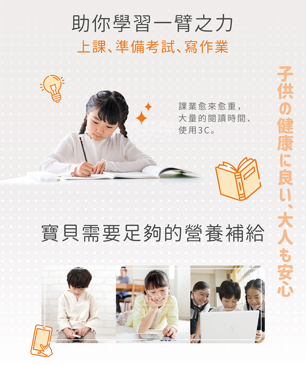 ● 專為學齡兒童設計,添加游離型葉黃素、玉米黃素、是經常閱讀、打電腦、看電視兒童的營養補充品。● 葉黃素是存在於蔬菜水果的一種類胡蘿蔔素,人體無法自行合成,必須由食物或營養補充品中攝取。● 特別配合花青素含量高的山桑子、黑豆萃取物、富含枸杞多醣的枸杞萃取物,維持機能健康,元氣滿分。● 有小朋友喜歡的藍莓果汁口味,不添加人工防腐劑,健康好吃無負擔。*山桑子萃取物本身為天然紫褐色,食用後舌頭略成紫褐色屬正常現象,請不用擔心。*本產品添加之保健成份會因時間遞減。*開封後請於1-2個月內食用完畢。請保存於30度C以下陰涼乾燥處或放入冰箱冷藏,避免高溫、日曬影響產品品質。