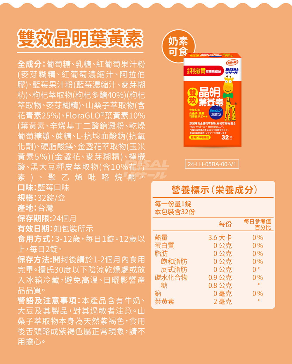 ●全成分:葡萄糖、乳糖、紅葡萄果汁粉(麥芽糊精、紅葡萄濃縮汁、阿拉伯膠)、藍莓果汁粉(藍莓濃縮汁、麥芽糊精)、枸杞萃取物(枸杞多醣40%)(枸杞萃取物、麥芽糊精)、山桑子萃取物(含花青素25%)、FloraGLO® 葉黃素10%(葉黃素、辛烯基丁二酸鈉澱粉、乾燥葡萄糖漿、蔗糖、L-抗壞血酸鈉(抗氧化劑))、硬脂酸鎂、金盞花萃取物(玉米黃素5%)(金盞花、麥芽糊精)、檸檬酸、黑大豆種皮萃取物(含10%花青素)、聚乙烯吡咯烷酮●內容量:32錠/盒●產地:台灣●保存期限:2年●保存方法:開封後請於1-2個月內食用完畢。請保存於30度c以下陰涼乾燥處或放入冰箱冷藏,避免高溫、日曬影響產品品質。●注意事項:山桑子萃取物本身為天然紫楬色,食用後舌頭略成紫褐色屬正常現象,請不用擔心●本產品含有牛奶、大豆及其製品,對其過敏者注意。