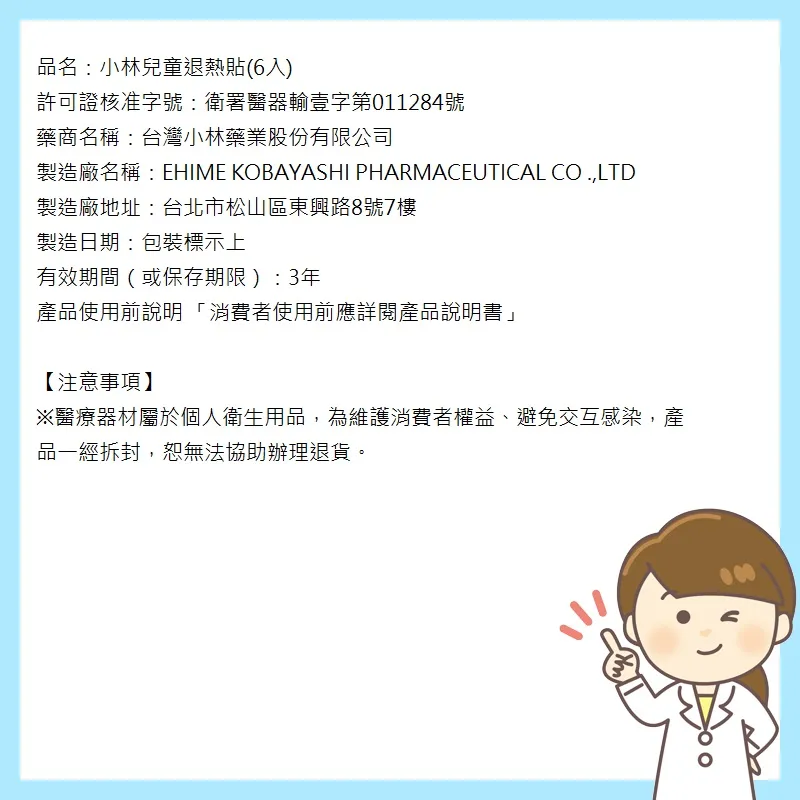 小林退熱貼添加獨特吸熱分子,貼在額頭上可達到退熱效果。特殊設計能與肌膚緊密貼合,不易脫落。不需冷藏,可常溫放置,方便取用。