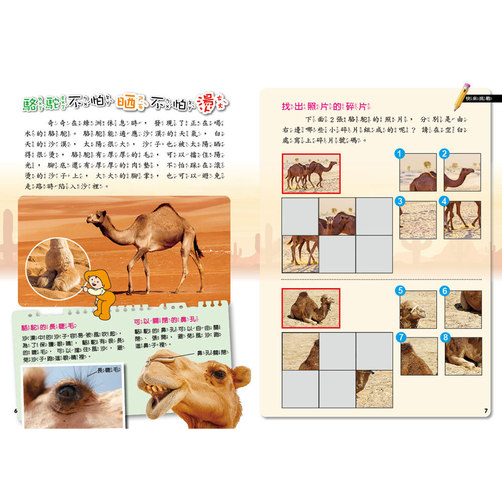 乾燥少雨的沙漠裡,住著各式各樣的奇妙動植物。是什麼樣的特異功能,讓它們能在缺少水分的環境下生活呢?快來看看《PLAY & LEARN:沙漠冒險》,認識仙人掌、石花、百歲蘭、駱駝、狐獴等20種動植物,還可以玩連連看、找不同、迷宮、邏輯訓練等遊戲,在有趣的遊戲中,學習豐富科學知識!