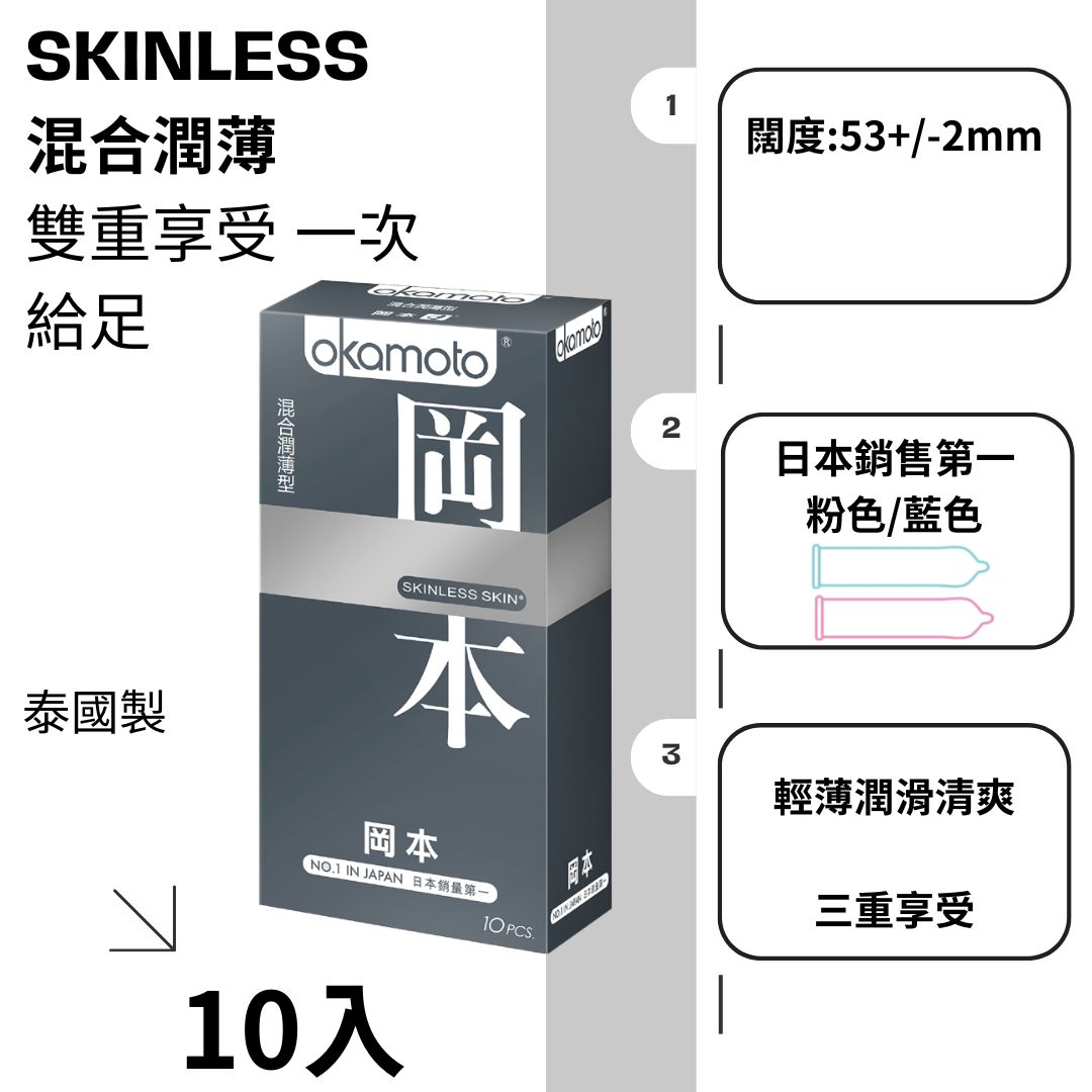 ♦︎醫療器材品名:"岡本" 衛生套 型號: SKINLESS-Super Mixede (混合潤薄型) 尺寸:53+/-2mm
