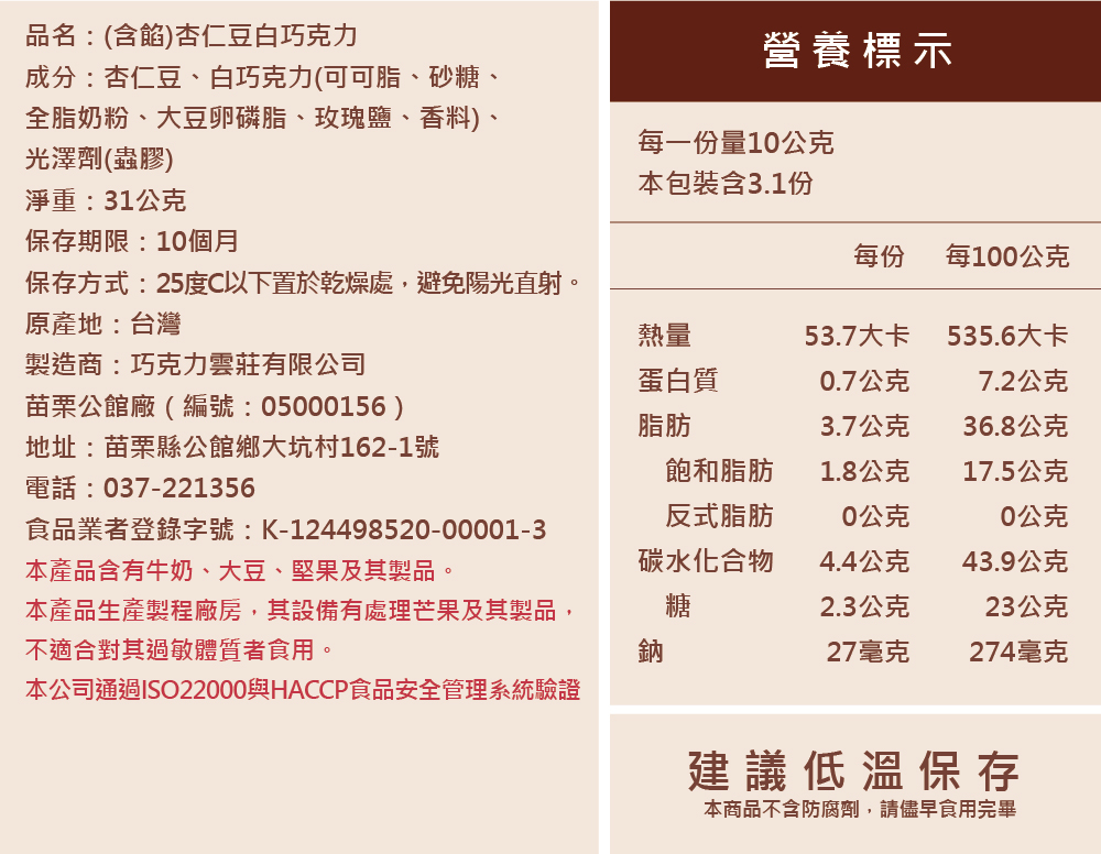 杏仁豆白巧克力-杏仁豆、白巧克力(可可脂、砂糖、全脂奶粉、大豆卵磷脂、玫瑰鹽、香料)、光澤劑(蟲膠)。