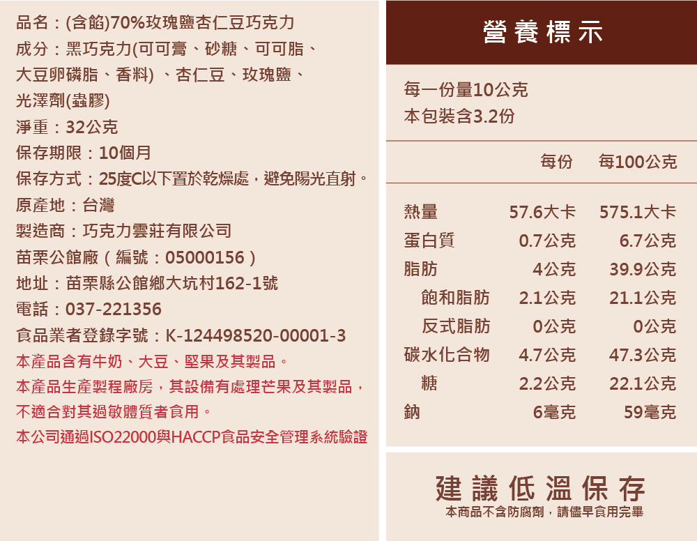 直火烘烤香脆杏仁,搭配雲莊特調香濃巧克力,4種口味一次滿足。