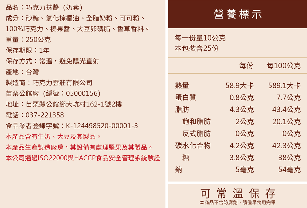 砂糖、氫化棕櫚油、全脂奶粉、可可粉、100%巧克力、榛果醬、大豆卵磷脂、香草香料。
