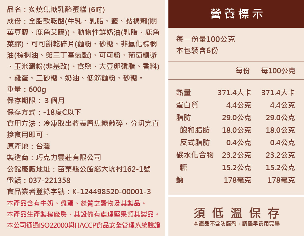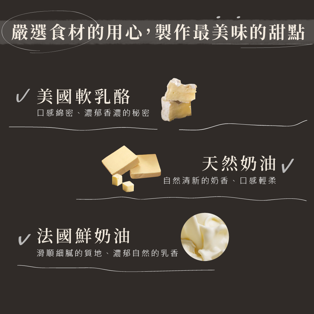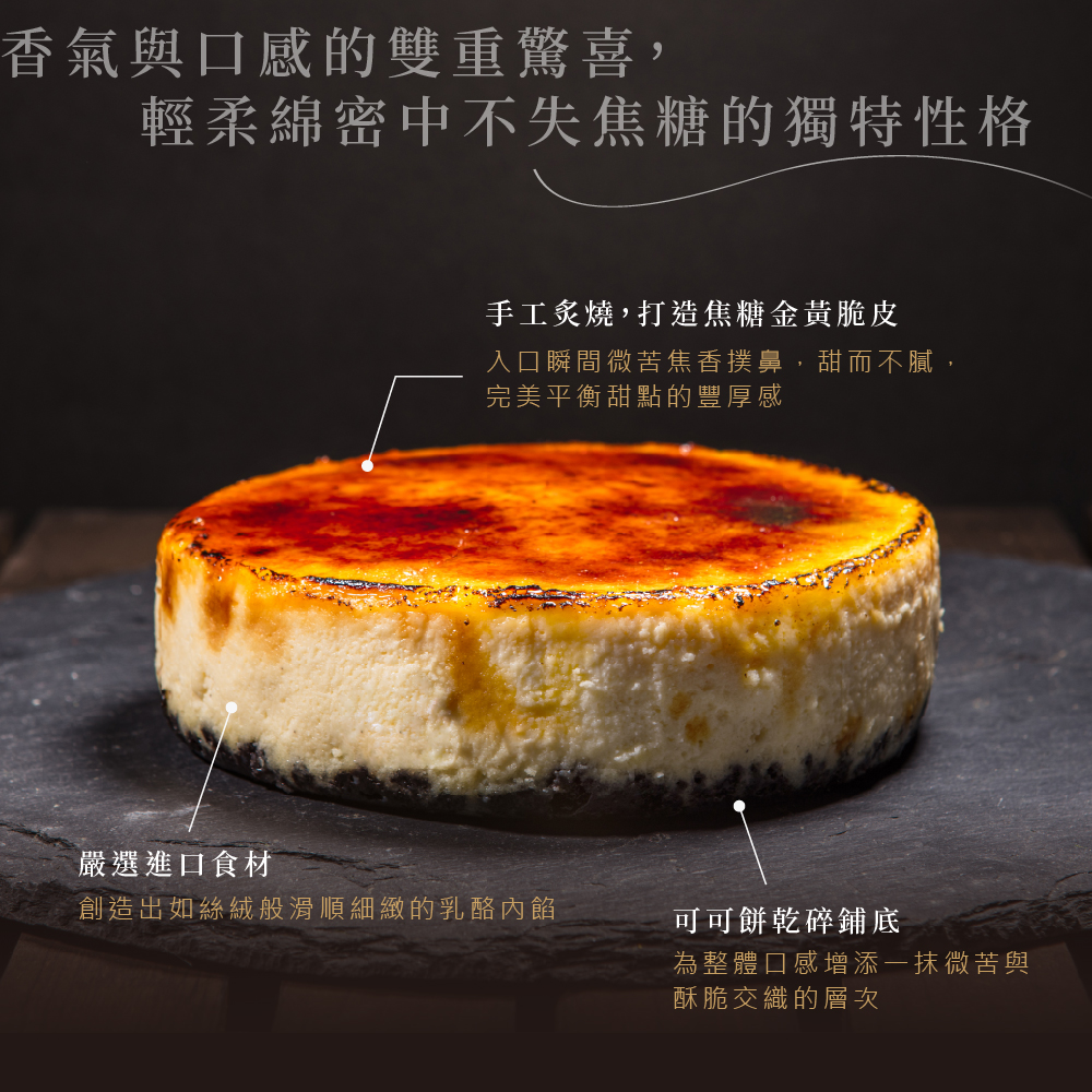 採用美國軟乳酪、天然奶油、法國鮮奶油及可可餅乾碎製成,炙燒焦糖帶微苦風味,脆皮口感甜而不膩,絲滑口感軟乳酪佐鮮奶油,交織馥郁香氣讓人難以忘懷,適合配搭茶飲、咖啡與紅酒。