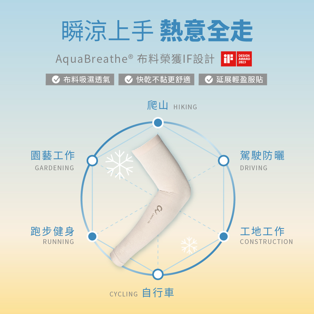 今年夏天,懂的人都在默默戴這個…🌿你以為只是袖套,其實是科技的隱形裝備?乍看平凡,實則內藏玄機——看似普通的素色袖套,為何一上市就在戶外族群中悄悄爆紅?因為它不只是「遮陽」,而是集涼感科技、防曬力、防臭、快乾透氣於一身的機能型涼感袖套!巧奇智能呼吸涼感袖套,選用榮獲 iF設計獎 的 Aquabreth 智能呼吸布料,具備 抗UV 50+ 等級防護,阻擋紫外線穿透率小於 2.5%。無論是戶外運動、騎車通勤、登山健行或日常穿搭,它都能輕鬆對應。貼身卻不緊繃,彈性極佳,連續穿戴也不悶熱不滑落,真正會呼吸的機能布料,給你肌膚最涼爽的保護感☀️ 機能亮點一次擁有:智能涼感科技|瞬涼材質,一戴即降溫A級防曬力|UPF50+ 抗UV,有效隔絕紫外線台灣製造 品質安心|通過 SGS 耐洗檢驗 4.5 級,不易掉色無感彈力設計|貼合手臂,不勒手、不滑落除臭快乾透氣|長時間配戴也清爽自在三雙入家庭組合|霧藍/米卡/豆沙綠配色,男女百搭不挑膚色環保夾鏈袋包裝|可重複使用,收納攜帶更方便 👕 為什麼大家都在戴它?因為這款袖套,不只功能強、外型簡約百搭,連穿搭控也讚嘆:「怎麼連機能袖套都這麼有質感!」別再忍受厚重悶熱的防曬用品,選擇一款真正舒適、好看、耐穿的防曬袖套,讓身體會呼吸的同時,也為地球減碳一點點。🔹 為什麼選這款袖套?Q&AQ1:尺寸是否為通用?會不會太緊?A:為高彈性貼身材質,適合大多數成人手臂尺寸,男女皆可穿戴,不緊繃不卡肉。Q2:可機洗嗎?會不會洗了就失去效果?A:可機洗,建議放入洗衣袋。經SGS檢驗耐洗等級達4.5級,正常清洗不易褪色或影響機能。Q3:涼感效果會隨時間減弱嗎?A:布料為非塗層型涼感技術,透過纖維結構實現涼感,效果持久穩定,並非一次性功能。Q4:適合什麼季節使用?A:適合春夏秋季或日照強烈時穿戴,能有效防曬降溫;冬季戶外也可搭配外套內穿作為防曬層使用。Q5:它的防曬效果到底有多強?A:通過 A級防曬 UV50+ 認證,紫外線穿透率<2.5%,可大幅降低 UVA/UVB 傷害 。Q6:長時間配戴會不會黏膩、悶熱?A:除臭、快乾、透氣三合一設計,加上超彈貼身又不緊繃的剪裁,不論是騎車汗流浹背,還是登山長時間活動,都能保持乾爽舒適。Q7:適合哪些人或場合?A:戶外運動族(跑者、登山客、露營者)都市通勤族(機車族、自行車騎士)長時間戶外工作者(建築、園丁、場地維護)注重防曬與時尚的日常穿搭愛好者 品牌介紹|巧奇致力於打造「機能 × 美感 × 永續」並存的日常穿搭單品。專注研發結合舒適體感與環保理念的機能服飾,嚴選台灣在地製造與創新布料技術,讓你從每一次配戴開始,感受不一樣的質感日常。我們相信,真正的好產品,不只來自細節的打磨,更是從生活需求出發,讓每個選擇都值得被穿上與重複使用。 【產品規格】品名:巧奇 智能呼吸涼感防曬袖套型號:CH9891材質:60%吸濕伸長纖維、32%尼龍、8%彈性纖維尺寸:FREE SIZE產地:台灣製造商:巧良實業股份有限公司地址:彰化縣田中鎮沙崙里新工一路36號電話:04-8751431 【注意事項】1,穿著時請注意是否穿戴會使勾破的飾品、手錶等物品,以免破壞塑身褲。2.穿著後請盡速清洗,以免影響衣物機能及衛生問題。3.清洗時切勿使用強力洗衣精及漂白水和柔軟精等清洗劑,限用手洗及冷水洗。4,清洗後置於通風處晾乾,避免太陽曝曬。5.切勿烘乾及吹風機熱風吹乾、燙熨及乾洗。* 商品拍攝時因受環境與光線影響,及螢幕色差與實品會有稍許誤差,實際顏色以實品為準 *