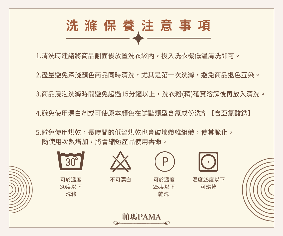 可水洗【水溫不超過30度】/不可烘乾/不可漂白/不可乾洗/不可高溫整燙勿使用強力漂白清潔劑/建議可放入大型洗衣袋後再清洗