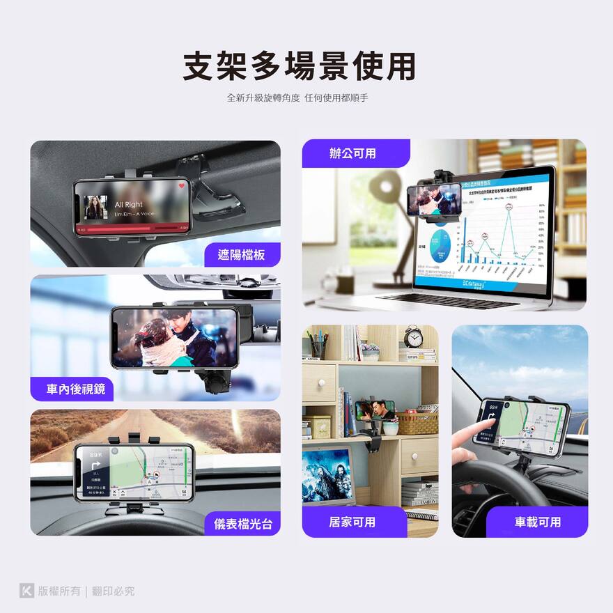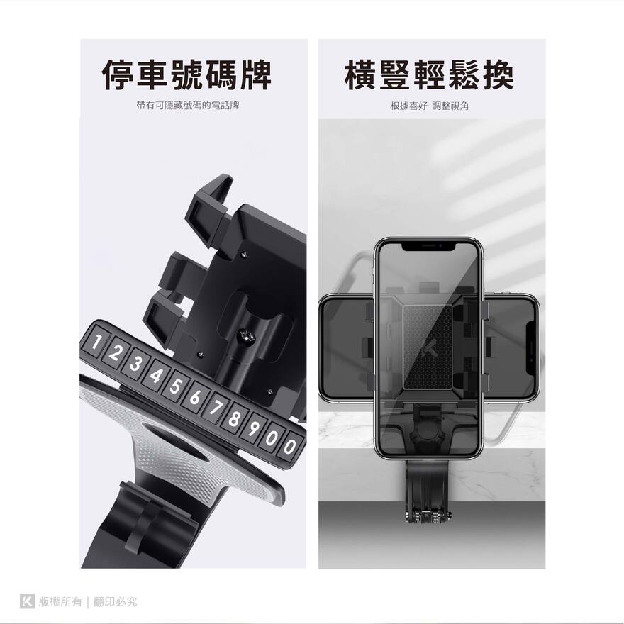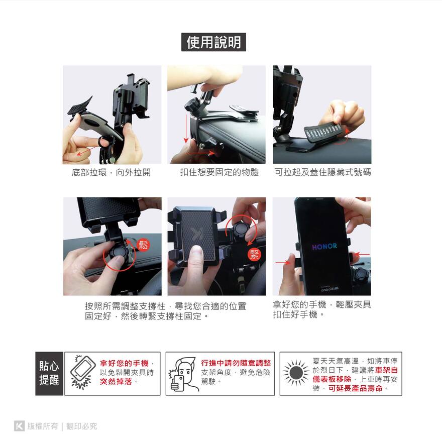 特色:■市面上唯一擁有多場景夾具的車用/家用手機支架。■擁有專利認證的多功能支架。■1200度隨心所欲自轉公轉,4大關節任意選擇角度,橫看/直看/斜角看。■牢牢咬住車用儀表板、遮陽板、車內後照鏡,單獨使用在家居、書房、辦公室、健身房有固定環境皆可以應用。■隱藏式停車電話號碼板,禮貌停車及保護隱私。■新式安裝拉環,輕易安裝及拆卸,加厚版防滑大面積矽膠靠墊不傷車子/家具。■任何位置配合多項旋轉,單手操作永遠視覺無死角。■手機4臂夾具緊實,矽膠防撞墊保護手機,適用3-7吋手機應用。■ABS材質防曬、防撞、防龜裂。商品規格產品尺寸 : 80*130*115mm產品重量 : 188g±5g產地 : 中國材質 : ABS塑膠+五金+矽膠包裝尺寸 : 128x102x125mm包裝內容 : 車架x1.保固卡x1.十字起子x1.號碼貼x1本產品一年保固:新品七天換貨 / 保修一年商品如有非人為損壞或瑕疵,新品請於購買七日內洽原購買地,並持發票 (或購買證明)與產品(包裝及配件需完整保留)。注意事項:1.該產品非玩具,請置於孩童不易取得之處,以免發生危險。2.請勿置於腐蝕或高溫環境中。3.請勿過度反向拉扯,避免人為損毀。4.購買前請先確認尺寸是否適用您的電子設備。5.本商品保固條款不針對該商品以外的應用設備做保固。6.當該商品使用在交通工具時。因使用者個人駕車習慣導致該商品及設備損壞時,當認定為人為損壞,非保固範圍內。