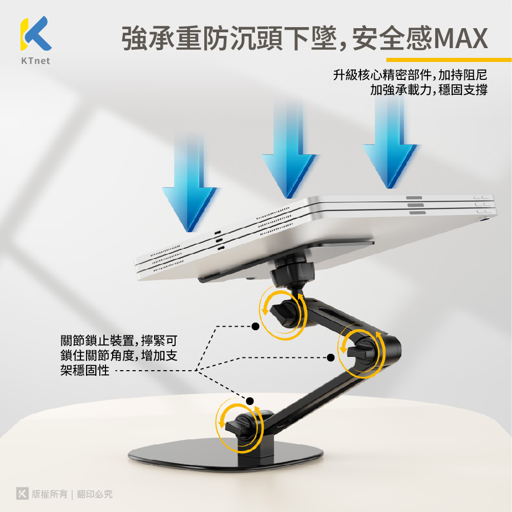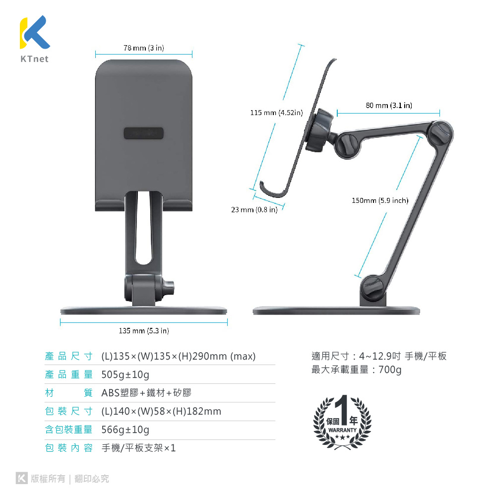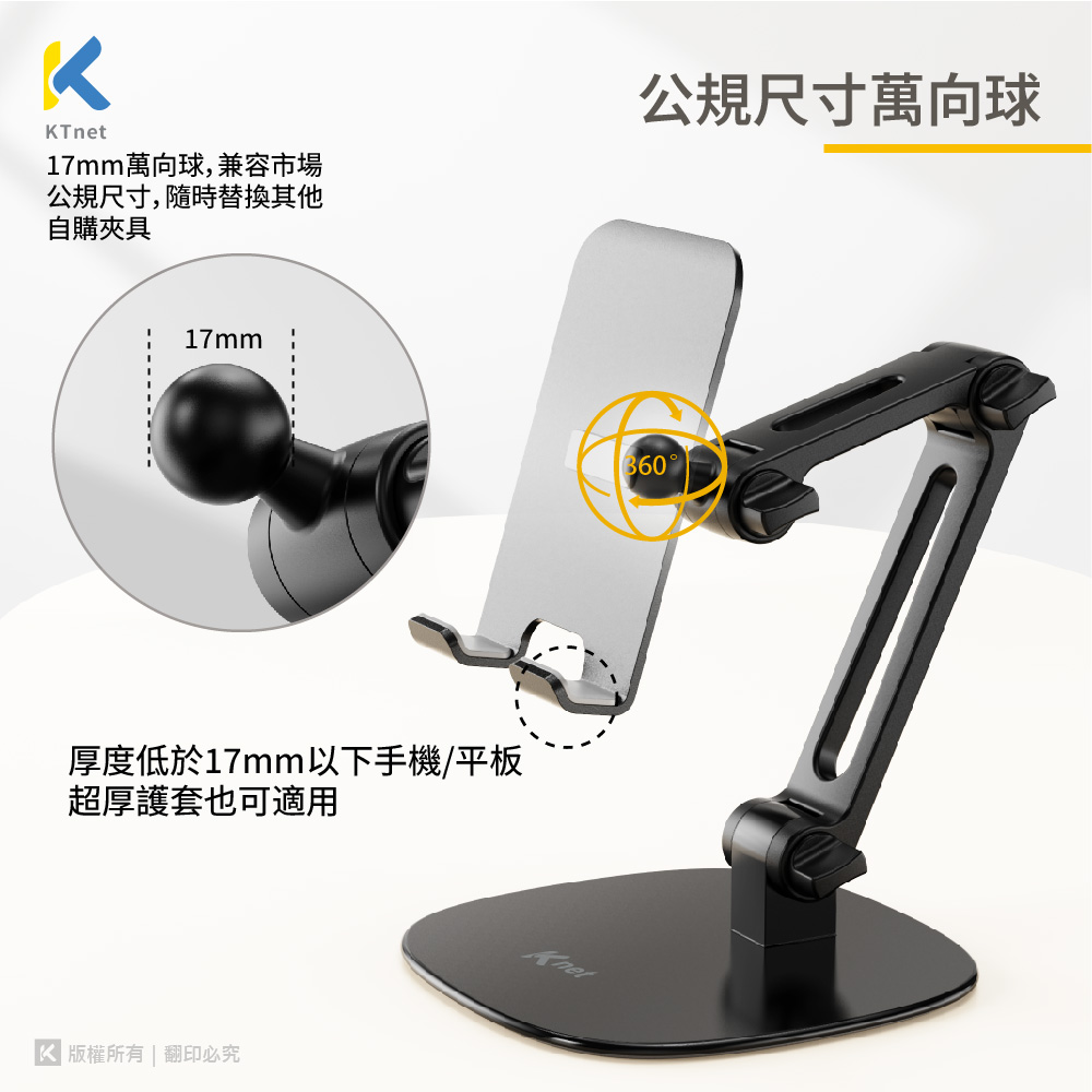 特色:■多元應用支架,雙鐵盤手機、平板多功能桌上型支架■1000個可調角度,三關節超過1000個角度可調整應用■手感穩重安全,13.5cm大鐵盤,金屬質感■設備及桌面接觸面積全矽膠墊防護,避免碰撞刮痕■手機/平板直放、橫放於托盤皆隨心所欲■公規尺寸17mm萬向球,兼容市場公規尺寸,隨時替換其他自購夾具■超厚保護套也可用,厚度低於17mm以下手機/平板產品尺寸 : (L)135×(W)135×(H)290mm (max)產品重量 : 505g±10g含包裝重量 : 566g±5g產 地 : 中國材 質 : ABS塑膠+鐵材+矽膠包裝尺寸 : (L)140×(W)58×(H)182mm包裝內容 : 手機/平板支架×1