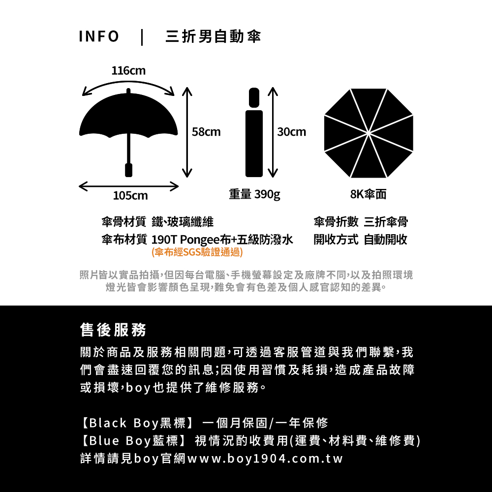 德國Boy傘-百年德國傘具,擁有超過100項專利技術✔️防潑水:擁有5級防潑水傘面✔️大傘面:傘下105遮蔽直徑✔️耐用:多角管中棒設計、雙段FRP、金屬綁線頭,風吹不易壞✔️抗風:玻璃纖維傘骨不怕翻傘✔️人體工學:舒適手柄設計,符合人體工學,久握也舒適✔️便利開收:一鍵自動開收功能