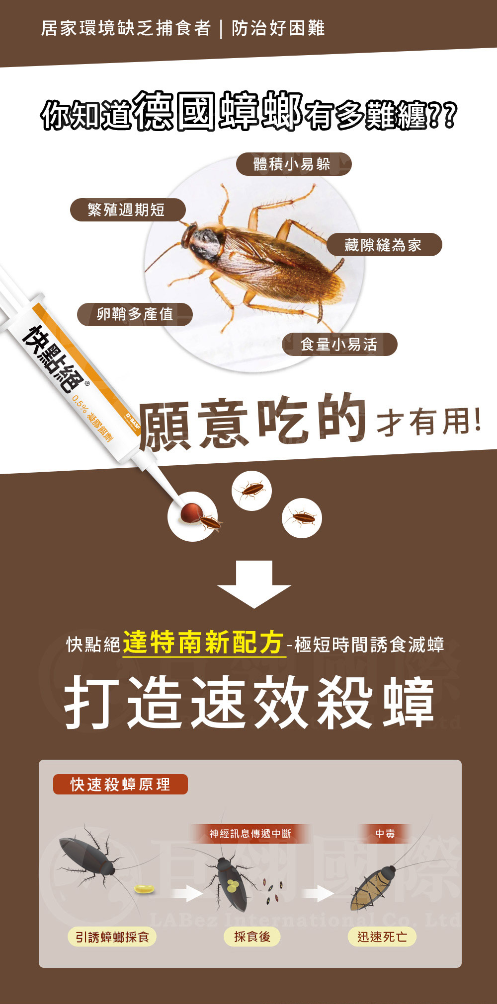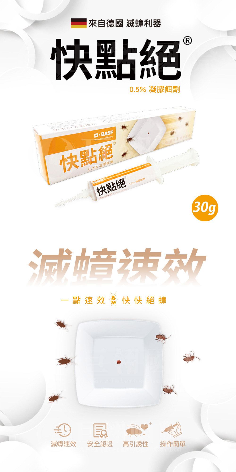 ●透過有效成分達特南搭配獨家配方,快點絕能在極短的時間內有效誘引德國蟑螂取食、