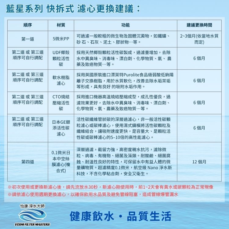 濾材一旦過水使用,即開始過濾水中各種雜質或汙染物,若超過建議更換時間未予更換,將無法確保過濾品質,嚴重將成為細菌溫床,反讓濾水系統汙染。為確保您飲水衛生安全,請定期更換濾心。