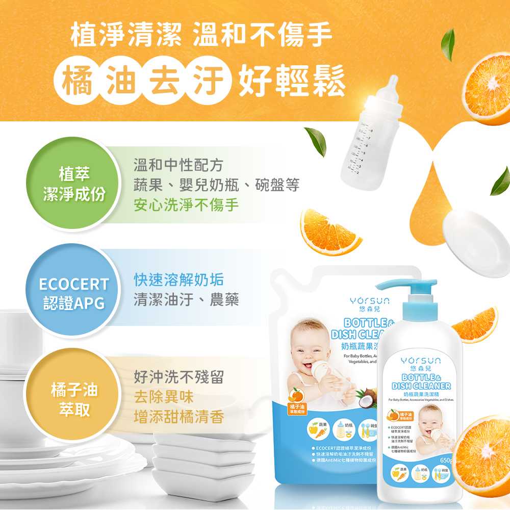 忙忙碌碌的生活 讓悠森兒幫忙分擔一些辛勞輕鬆清潔 把時間花在美好的事物上✓ 德國7種植萃抑菌配方 & 衛福部正面表列抗菌成份 CHX,安心抗菌✓ ECOCERT認證APG & 甜菜鹼洗淨成份,可高生物分解,環保愛地球✓ 符合CNS3800國家標準,安心守護✓ 橘油萃取,快速溶解奶垢,清潔油汙、農藥,好沖洗不殘留,去除異味,增添甜橘清香✓ 溫和pH6.5配方,輕鬆洗淨蔬果、嬰兒奶瓶、碗盤等,安心洗淨不傷手✓ 無添加磷、甲醛、壬基酚、螢光劑、 漂白劑、 PARABEN、MI/MCI易敏防腐劑等有害物質✓ ISO認證工廠、台灣製造