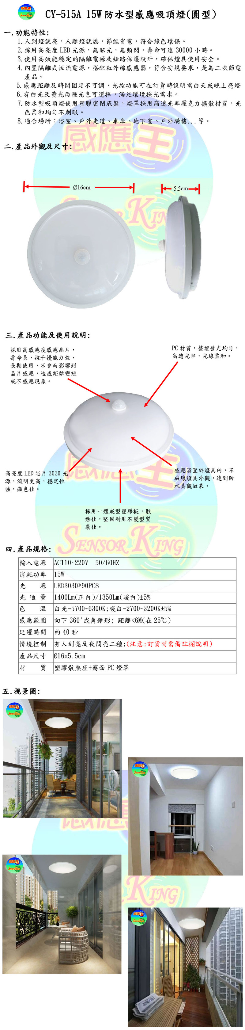 CY-515A 15W防水型紅外線感應吸頂燈