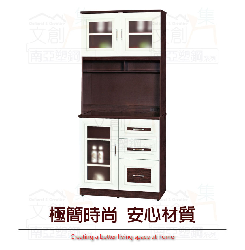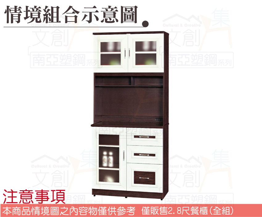 【文創集】麥卡 環保2.8尺南亞塑鋼單門三抽高餐櫃/收納櫃組合 產品採用第一品牌-台製南亞塑鋼舒美板+五金滑軌結構材質,整體材質採用防水+防燃+無甲醛安心塑鋼材質製造 ,搭配開門櫃+三抽屜+內開放式層格等便利收納空間設計,防止受潮,增加支撐力,堅固不會塌陷,全由專人配送到家,專業安心服務,替你省下更多時間!