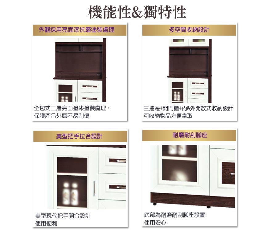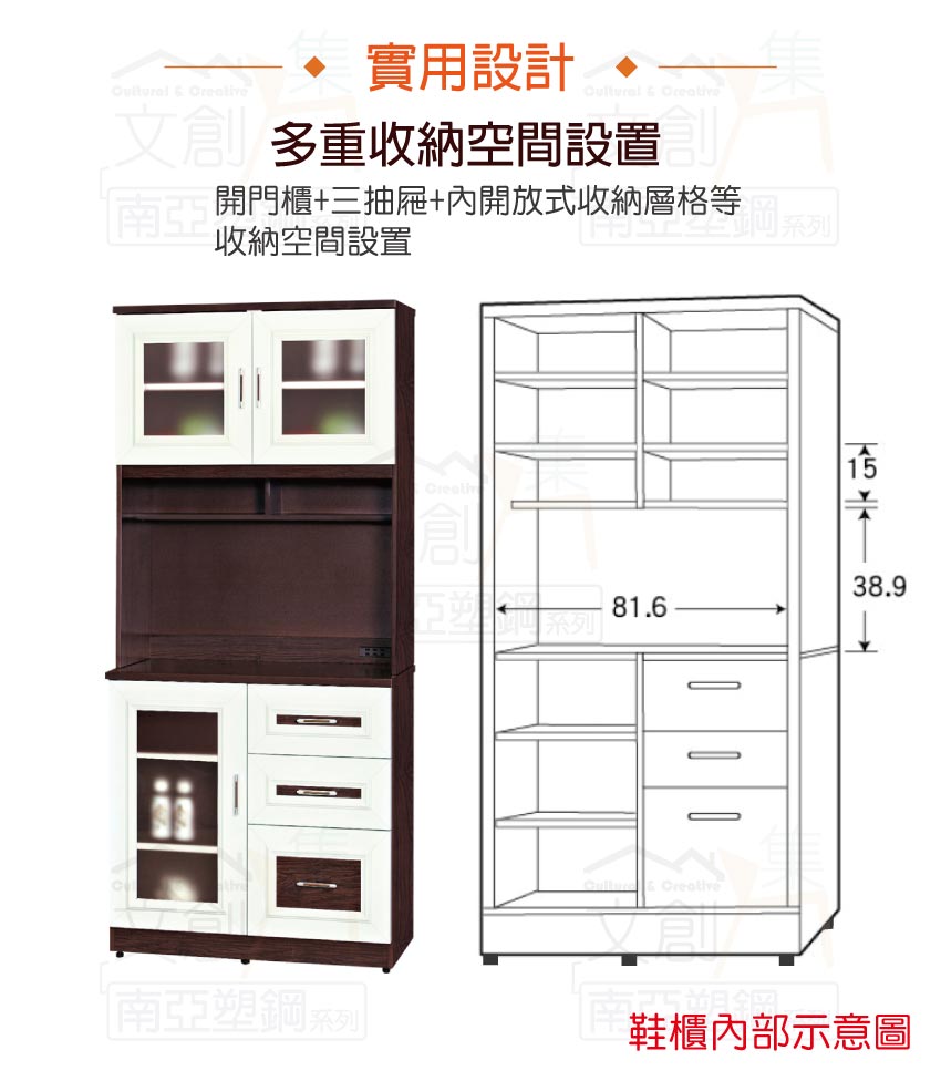 開門櫃+三抽屜+內&外開放式層格等便利收納空間設計