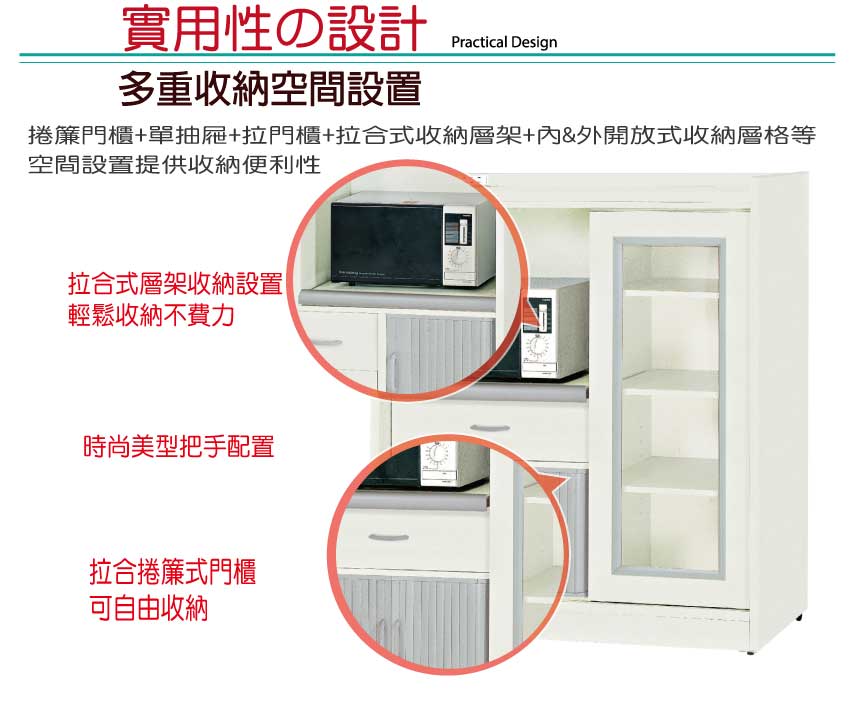 拉合捲門櫃+單開門+單抽屜+內&外開放式層格+拉合式層架等便利收納空間設計