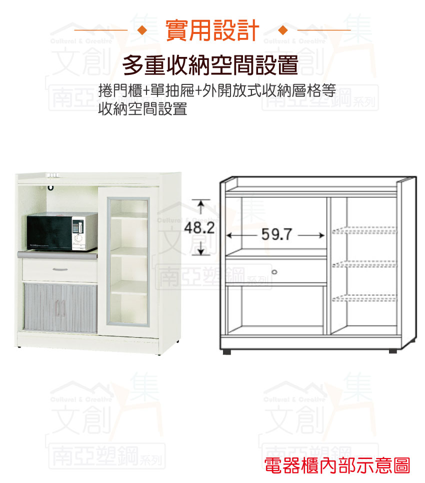 【文創集】菲莉 環保3.7尺南亞塑鋼拉合捲門單開門單抽層架中餐櫃/收納櫃 產品採用第一品牌-台製南亞塑鋼舒美板+五金滑軌結構材質,整體材質採用防水+防燃+無甲醛安心塑鋼材質製造 ,搭配拉合捲門櫃+單開門+單抽屜+內&外開放式層格+拉合式層架等便利收納空間設計,防止受潮,增加支撐力,堅固不會塌陷,全由專人配送到家,專業安心服務,替你省下更多時間!