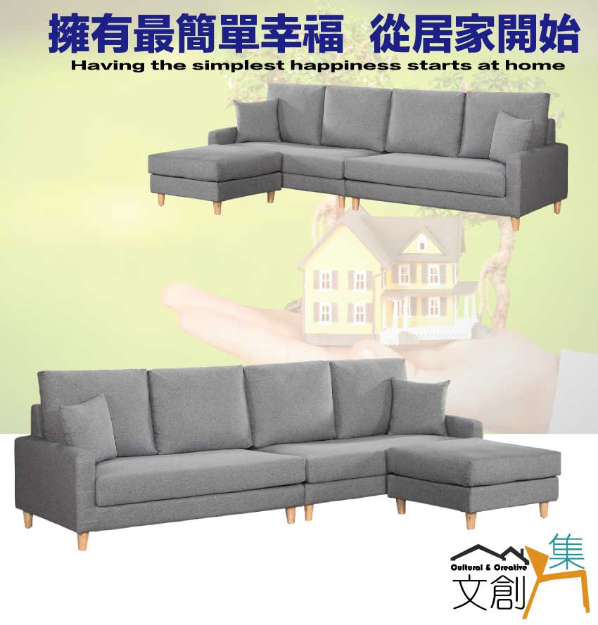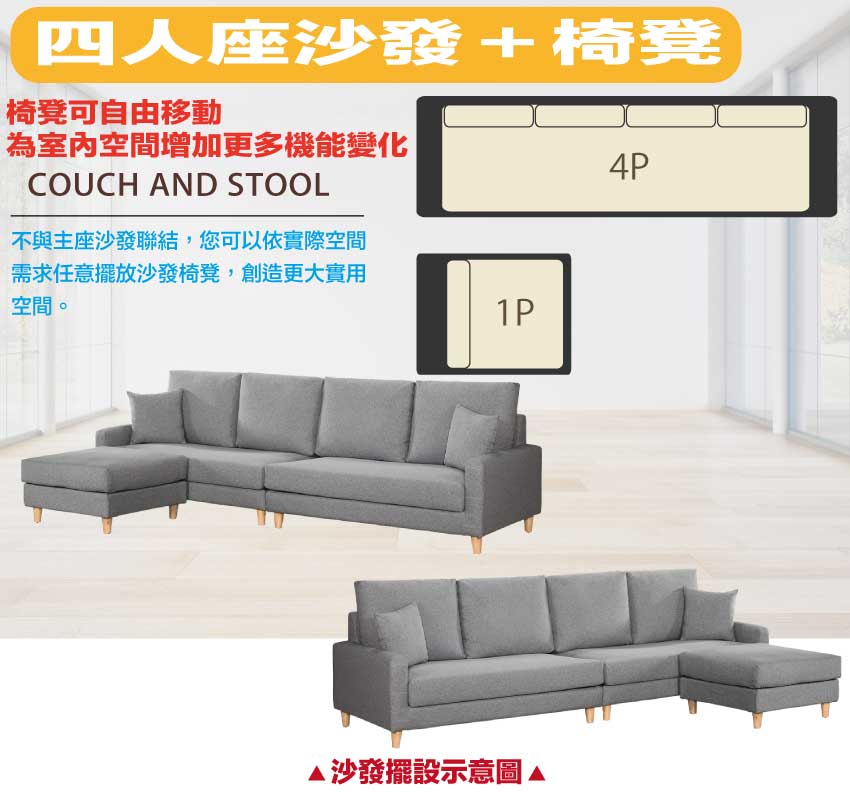 此組L型沙發椅為四人座+椅凳組合,椅凳可視使用需求自由擺放增加居家空間變化便利性