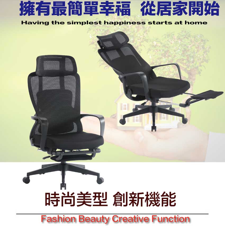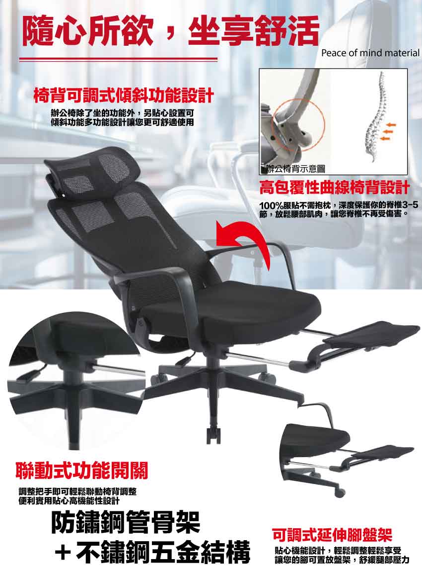 辦公椅搭配採用椅背可後仰&坐墊高度調整+連動式伸縮腳靠枕等機能性設計