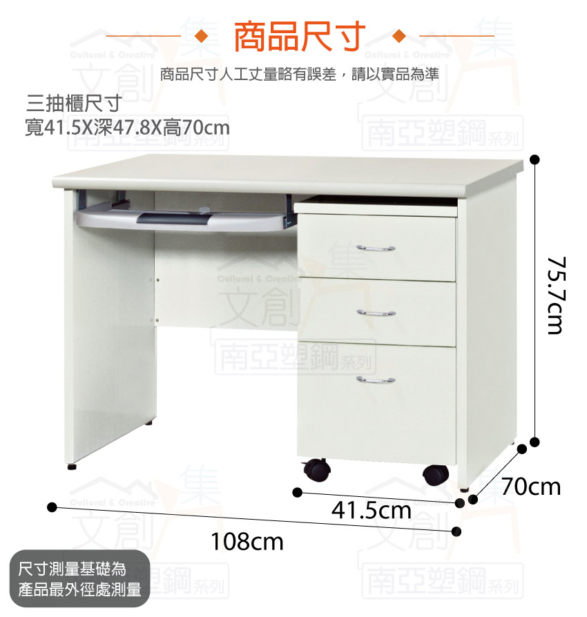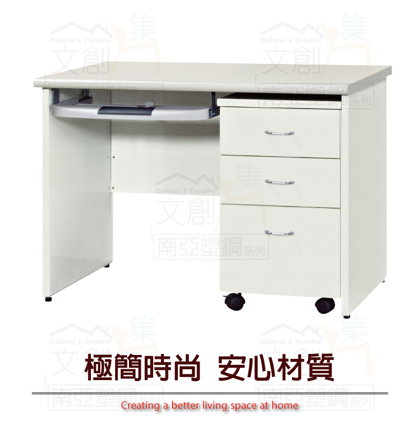 【文創集】艾莉 環保3.6尺南亞塑鋼鍵盤書桌組合(書桌+活動櫃) 產品採用第一品牌-台製南亞塑鋼舒美板+五金滑軌結構等材質,整體材質採用防水+防燃+無甲醛安心塑鋼材質製造 ,搭配拉合式鍵盤架+開放收納層格+三抽屜活動櫃等便利收納空間設計,防止受潮,增加支撐力,堅固不會塌陷,全由專人配送到家,專業安心服務,替你省下更多時間!