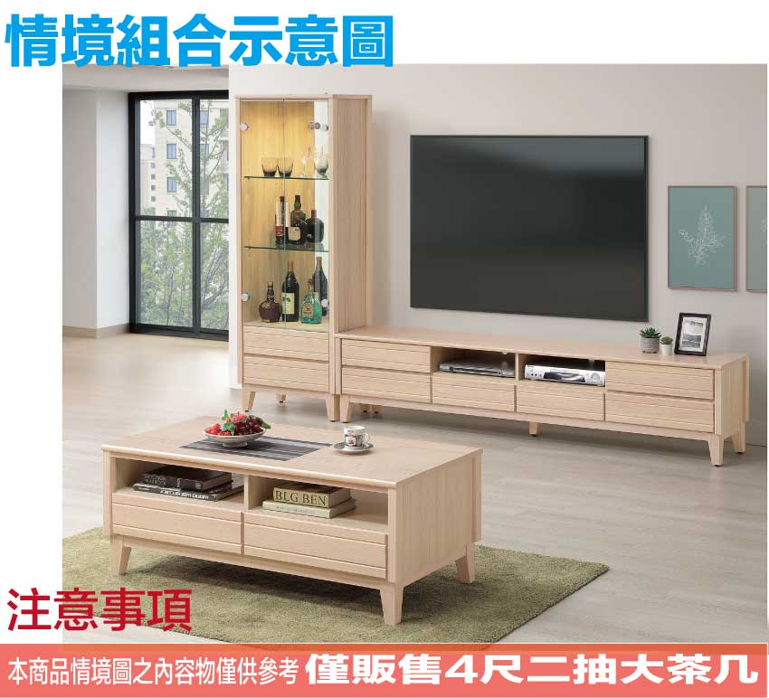 【文創集】瑞歐4尺二抽大茶几 米白木紋色系+安心材質製造,使用放心+搭配居家更便利,採用防蛀木心板+實木防刮腳座+五金滑軌結構等安心材質製造 ,外層採用防潮耐磨噴漆處理搭配採用二抽屜+開放層格等收納空間設計,全由專人配送到家,專業安心服務,替你省下更多時間!