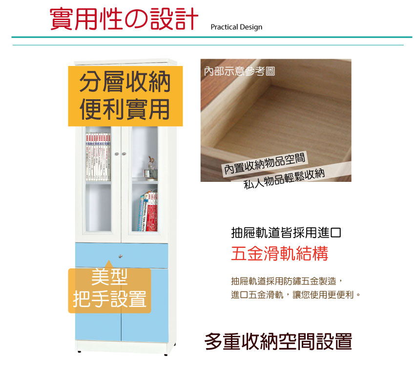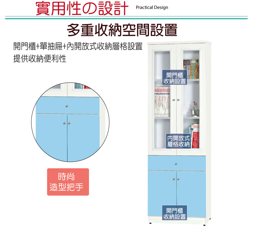 搭配開門櫃+單抽屜+內開放式收納等便利設計