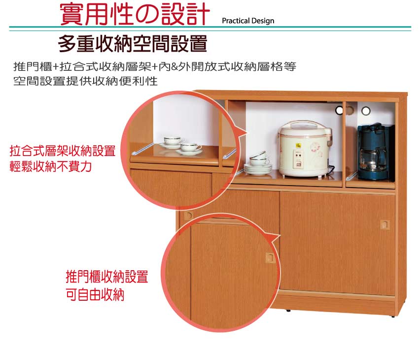 推門櫃+內&外開放式層格+拉合式層架等便利收納空間設計